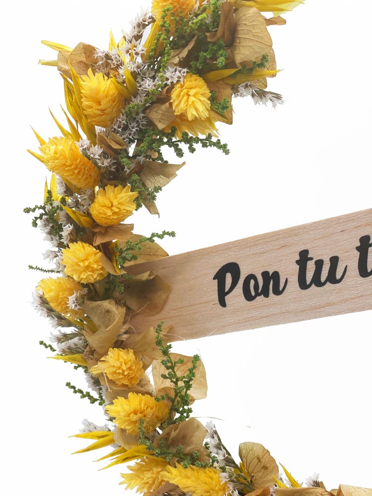 Aro floral con flores secas y preservadas para colgar y personalizable. Puedes escoger la tonalidad de las flores que más te guste y darle un toque personal indicándonos un nombre, fecha... que nosotros añadiremos a la banda de madera. Plazo de elaboración: 48/72 h.