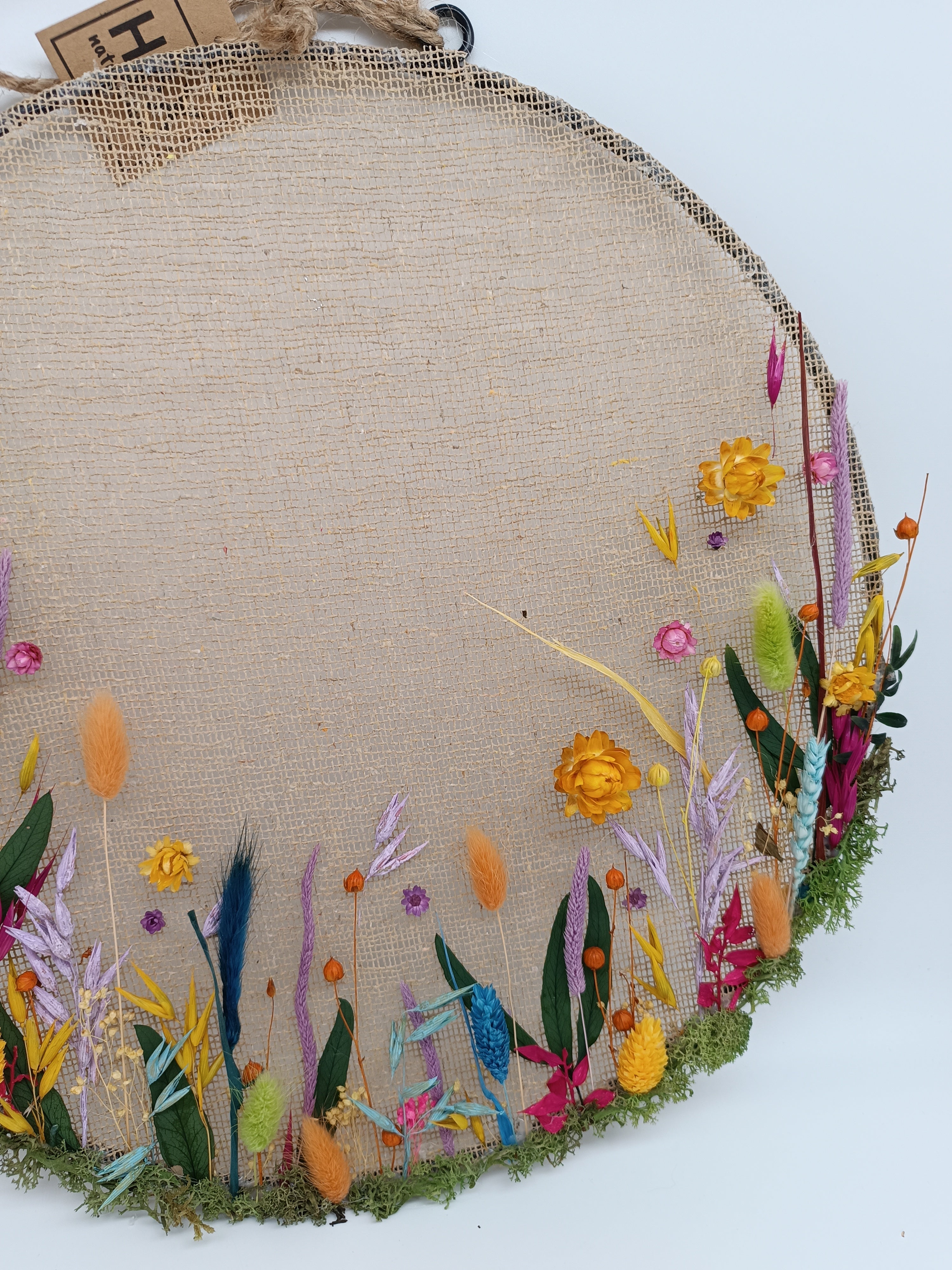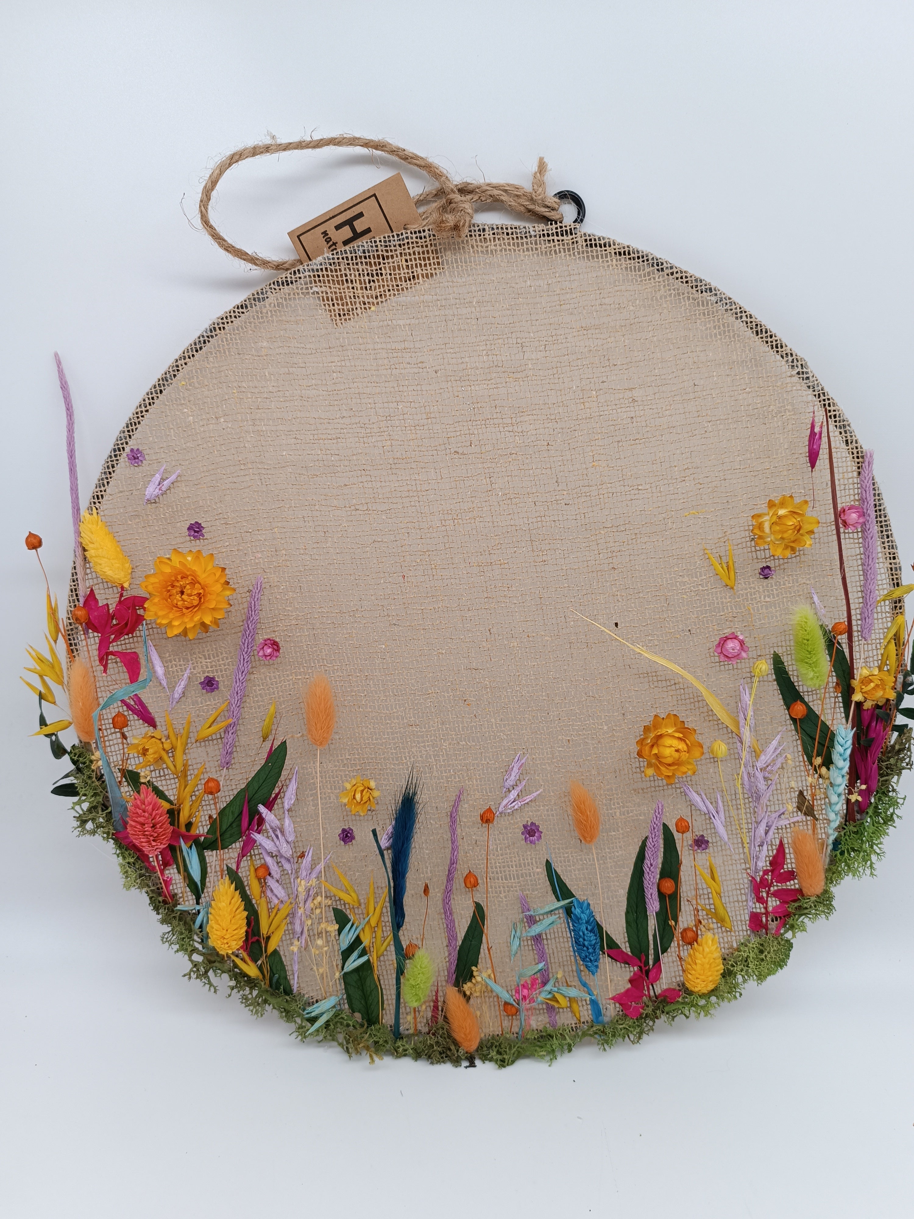 IN LOVE con este Jardín Preservado para colgar, tanto sobre tus paredes cómo para suspender del techo. Se trata de un aro metálico con una cubierta de tela de yute sobre el que hemos colocado una a una diferentes flores secas y preservadas multicolores. El plazo de elaboración desde la recepción de tu pedido es de 72 horas y después estará listo para ser enviado por agencia. Sí prefieres que la gama de colores sea otra no tienes más que decírnoslo en el apartado de observaciones que aparecerá al realizar el pedido. Tienes dos tamaños diferentes para escoger.