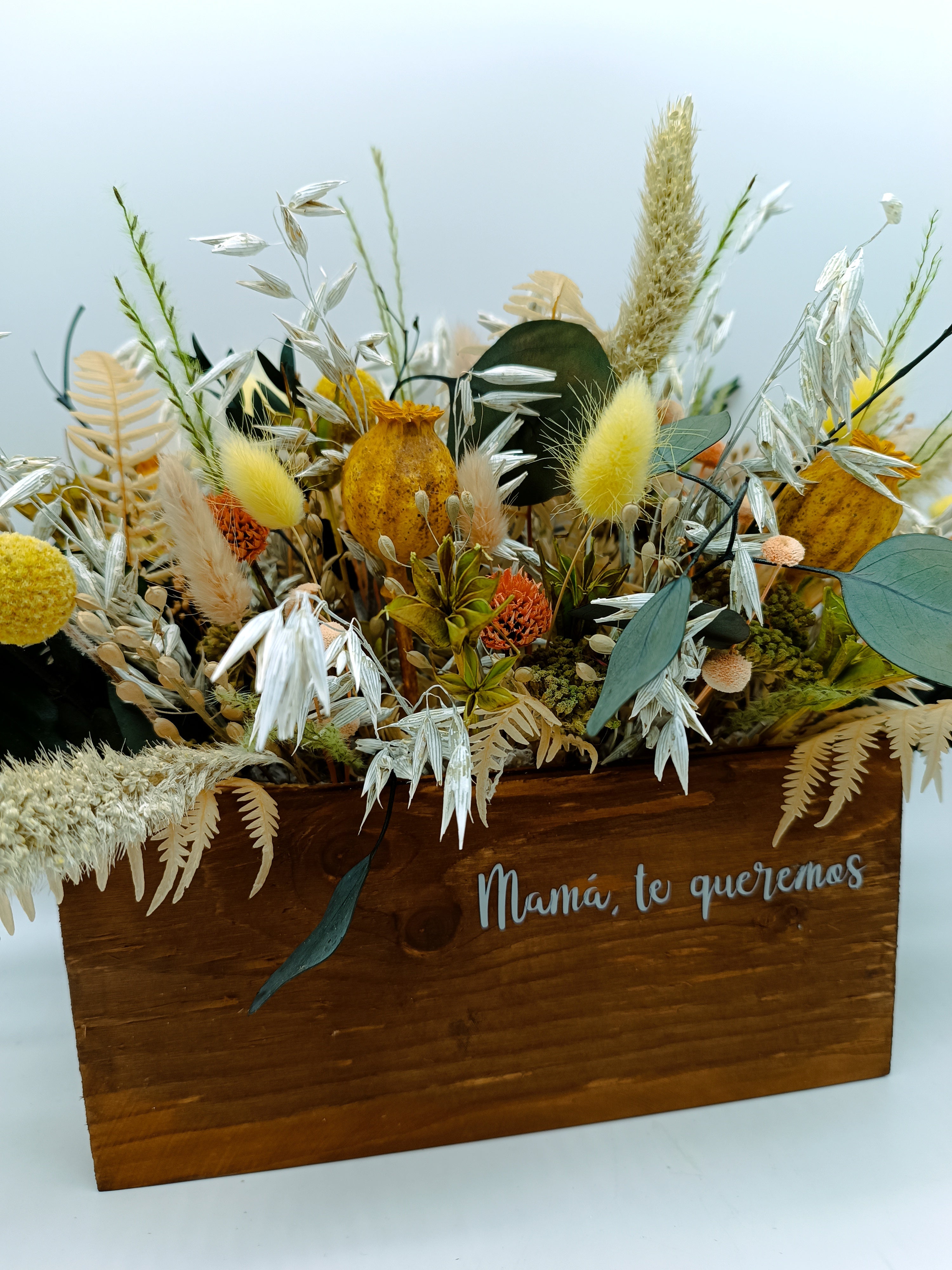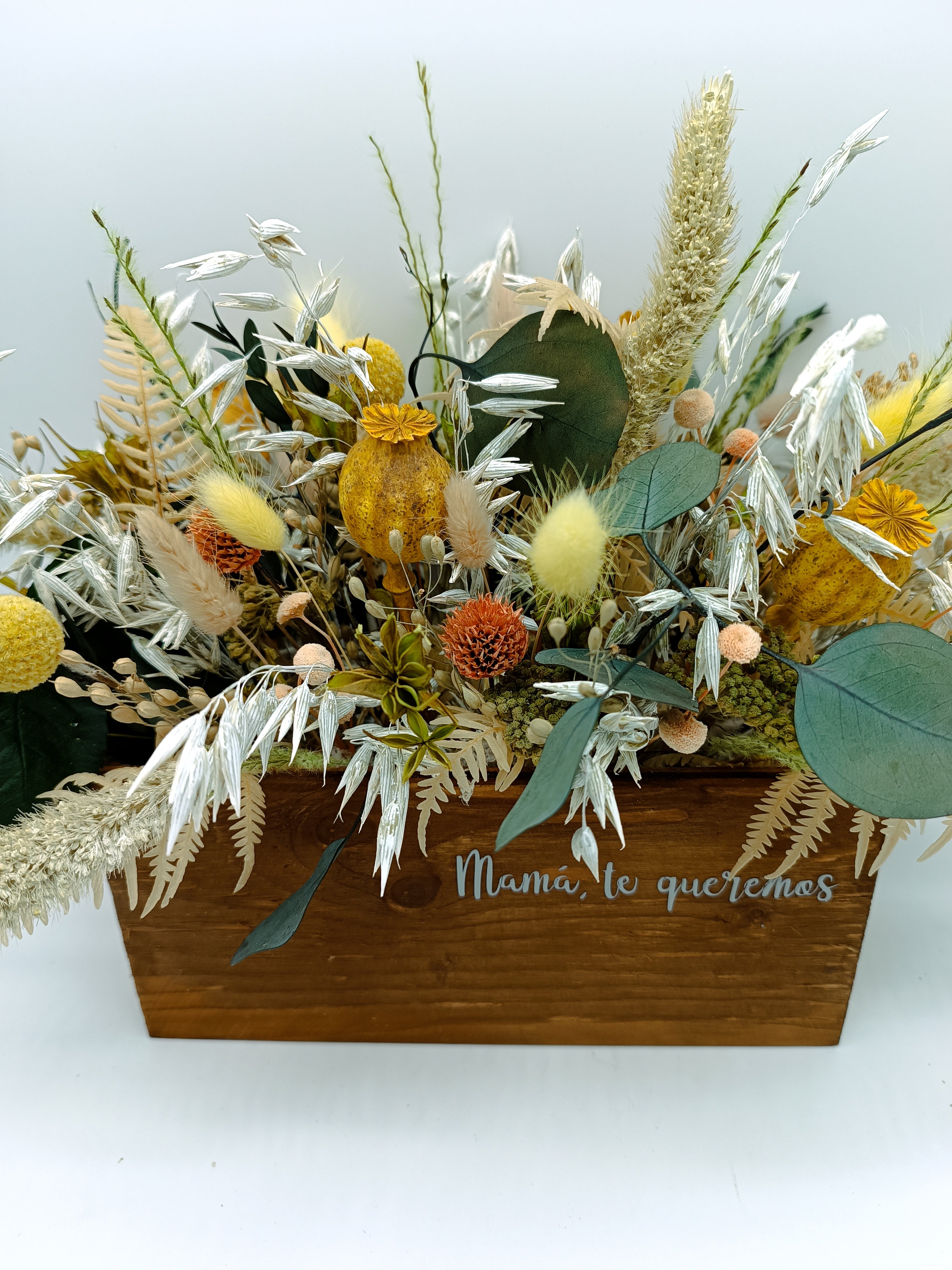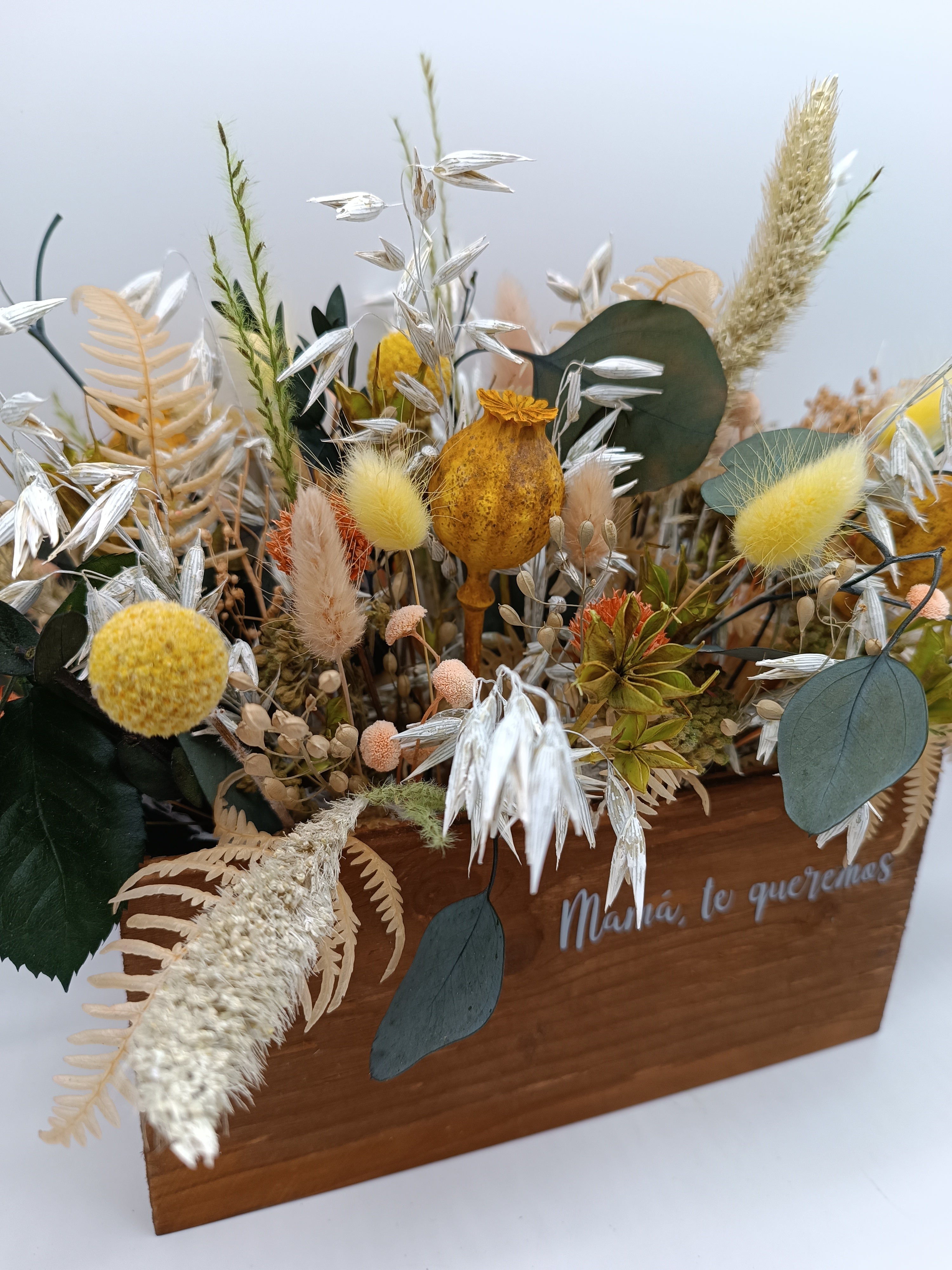Para que Mamá se sienta muy, muy especial, hemos preparado este cajón con flores secas y preservadas que lleva impreso lo que más le gusta a nuestras madres que le digamos. Tenemos disponible el cajón en blanco roto y en madera oscura cómo aparece en la foto. Puedes indicarnos qué modelo prefieres y la tonalidad del trabajo (ocres, rosados, malvas, verdes...) así cómo el mensaje o frase que quieras que pongamos (máximo cinco o seis palabras). En el apartado de observaciones del final del proceso de compra nos lo puedes decir o poniéndote en contacto con nosotras en el 604 05 44 71. Plazo de elaboración: 48/72 h