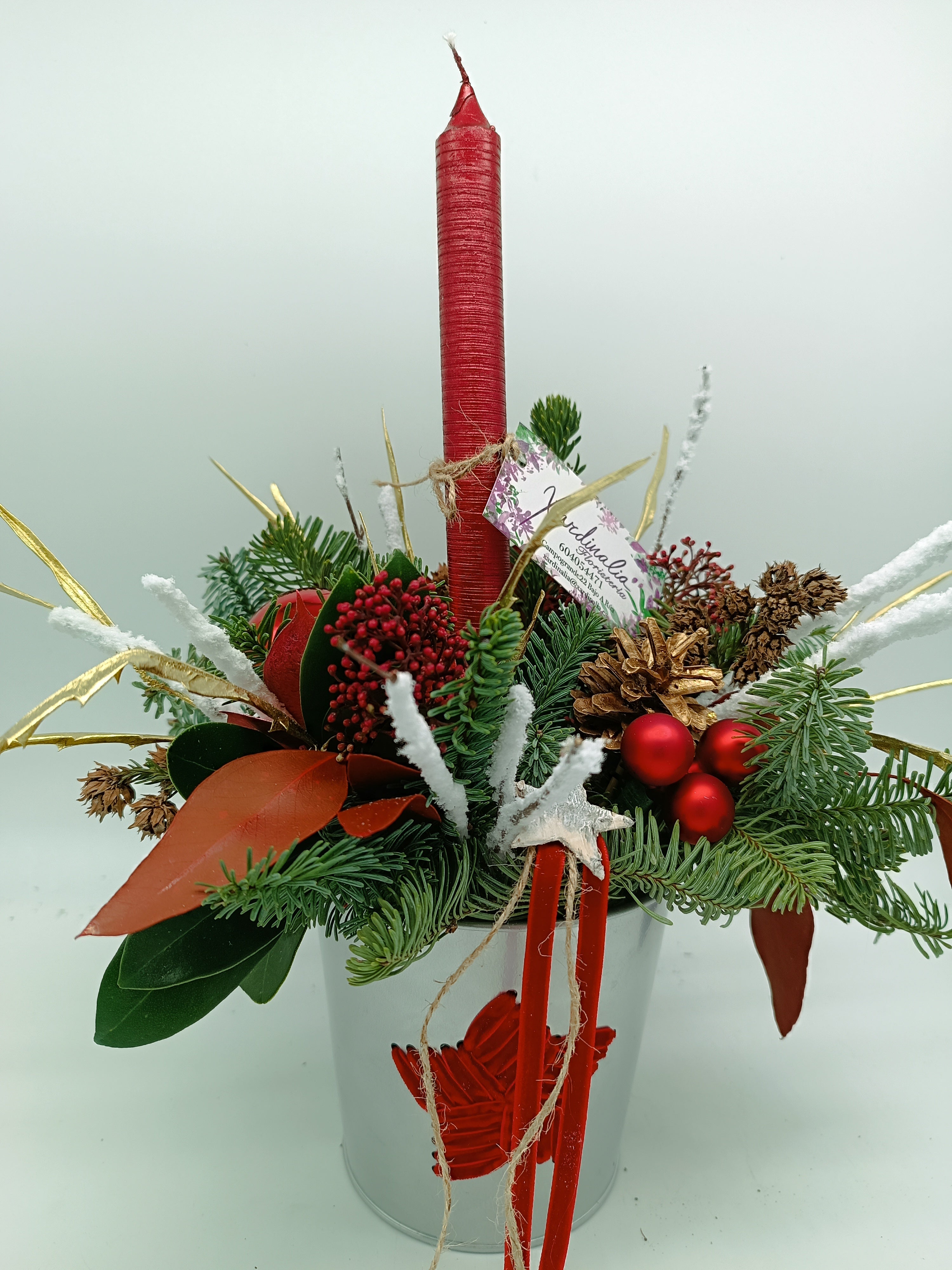 Nuestro centro navideño elaborado con verdes naturales sobre una base de zinces sin duda la mejor opción para regalar en estas fechas.  Una alternativa a la clásica flor de pascua o a nuestro Ramos navideños tanto en natural como en preservado.  Te van a enamorar sus toques al puro estilo centroeuropeo como son la presencia de naranja deshidratada, canela y flor de algodón. El formato más pequeño de nuestros centros navideños adaptándose a cualquier bolsillo; para que todo el mundo pueda disfrutar de una composición navideña en estas fechas que se aproximan.
