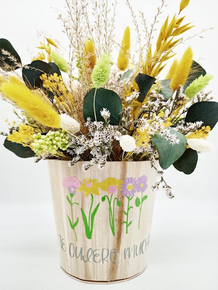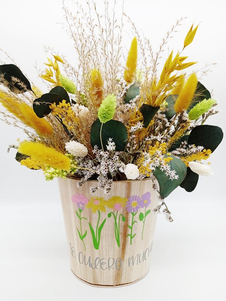 Centro floral preservado en base de madera. Puedes personalizar este trabajo indicándonos un nombre, fecha o frase para adherir a la caja en forma de vinilo. También nos puedes indicar que gama de colores te gustaría que empleásemos. Plazo de elaboración: 48/72 h