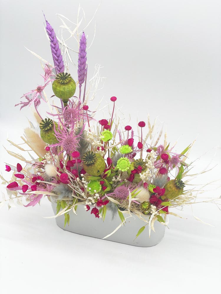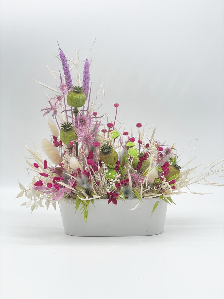 Jardinera en cerámica blanca con trabajo preservado. En abanico, en "L", libre...dinos qué colores te gustan y haremos magia con la flores preservadas. Plazo de elaboración: 48/72 h