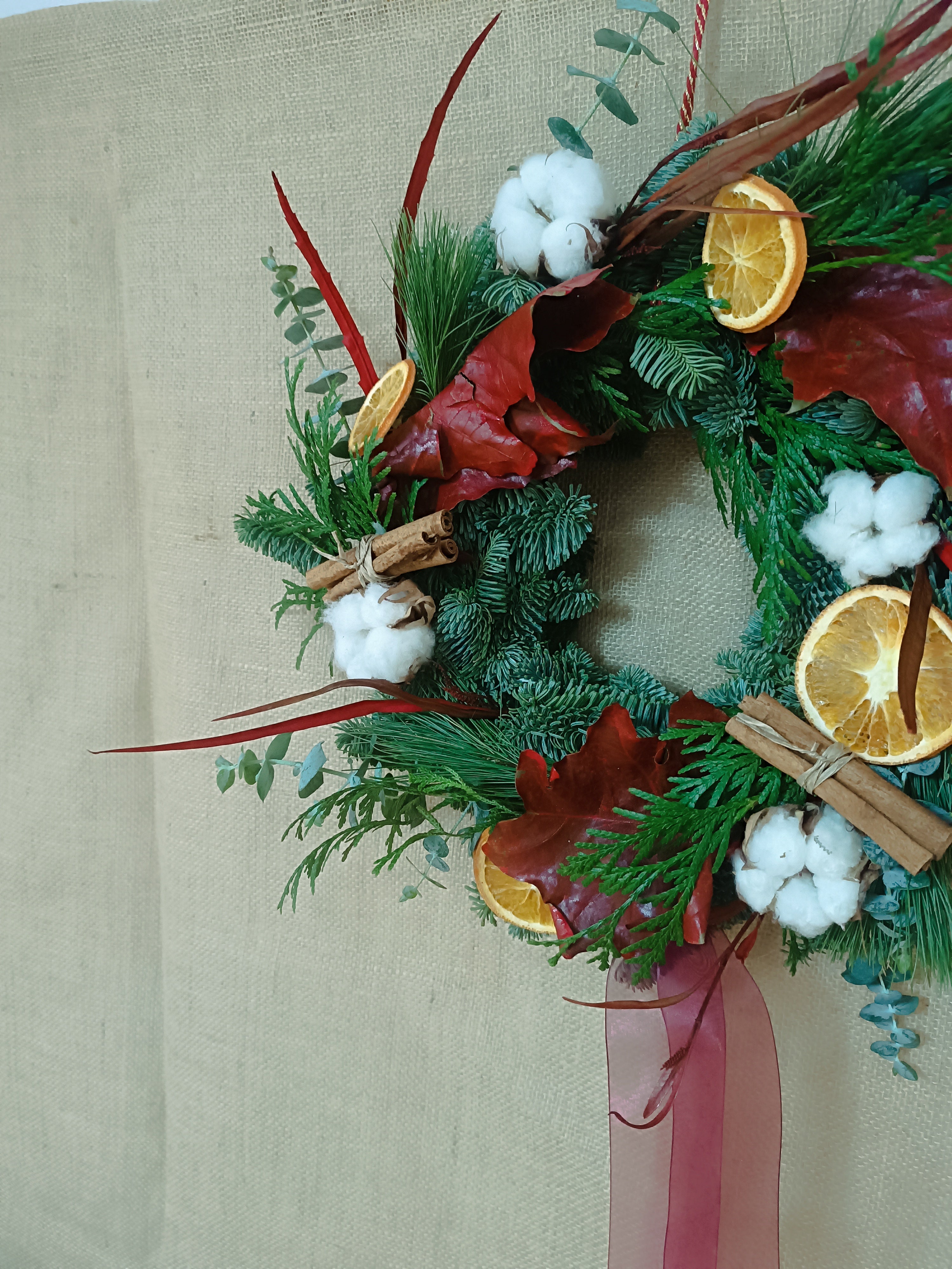 Si eres un/una amante del DIY este producto es ideal para ti. O sí conoces a alguien que lo sea y quieres sorprenderl@, es ideal para regalar. En esta Caja Especial de Navidad encontrarás todos los elementos necesarios para confeccionar esta preciosidad de Corona Navideña así cómo un código QR para acceder al vídeo explicativo. Tan sólo deberás disponer de una tijera y una pistola de silicona caliente  La caja contiene: - Corona de 30 cm elaborada con abeto nobilis. - Cinco varas de eucalipto. - Cinco varas de Grevillea roja. - Cuatro varas de Thuya - Cuatro hojas de roble americano tintado de rojo. - Cuatro varas de pino mucho  - Cinco flor de algodón. - Cuatro rodajas de naranja deshidratada  - Seis palitos de canela. - Lazo Organza burdeos  - Cordón navideño. - Alambre forrado  - Tarjeta con código QR para acceso a vídeo explicativo.