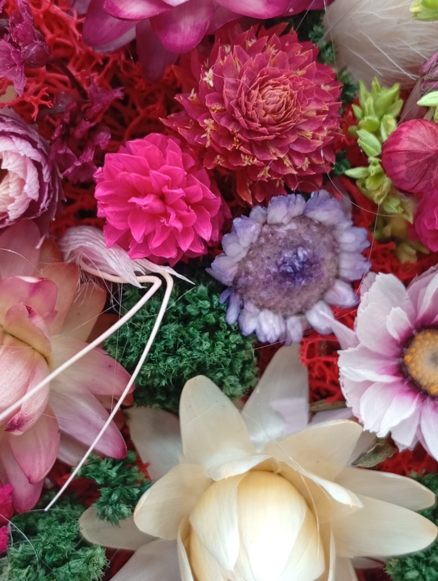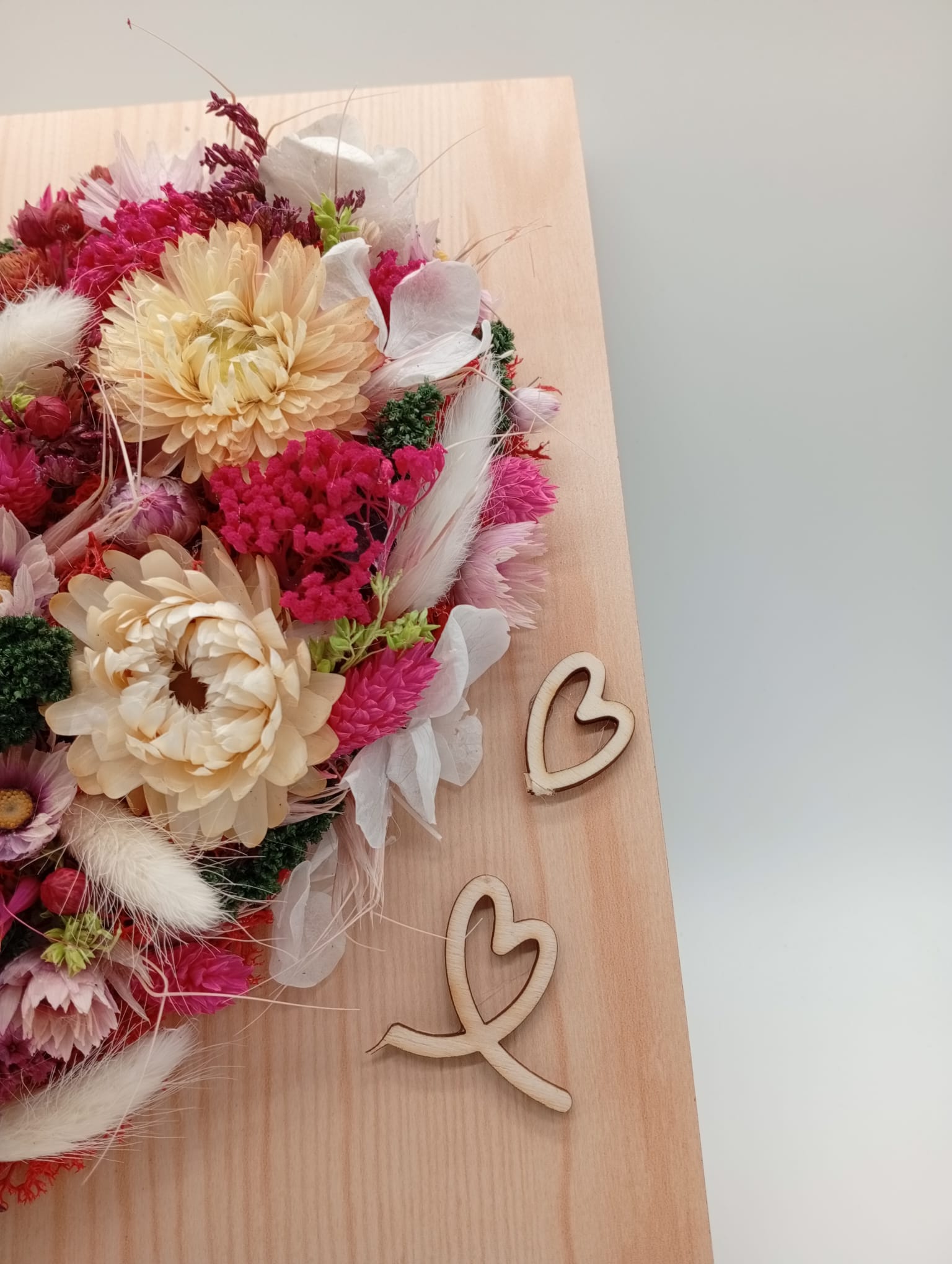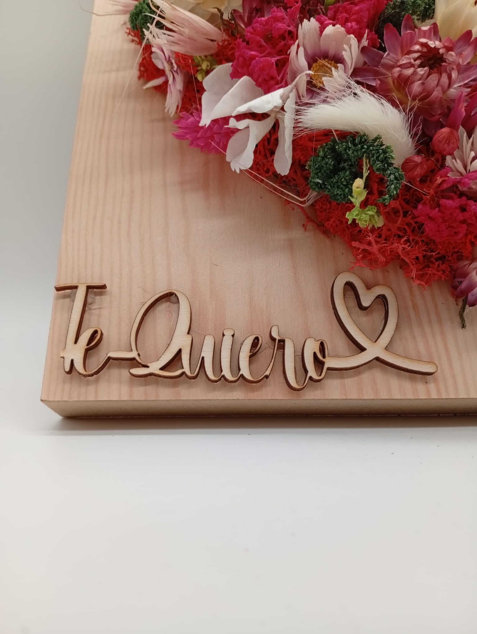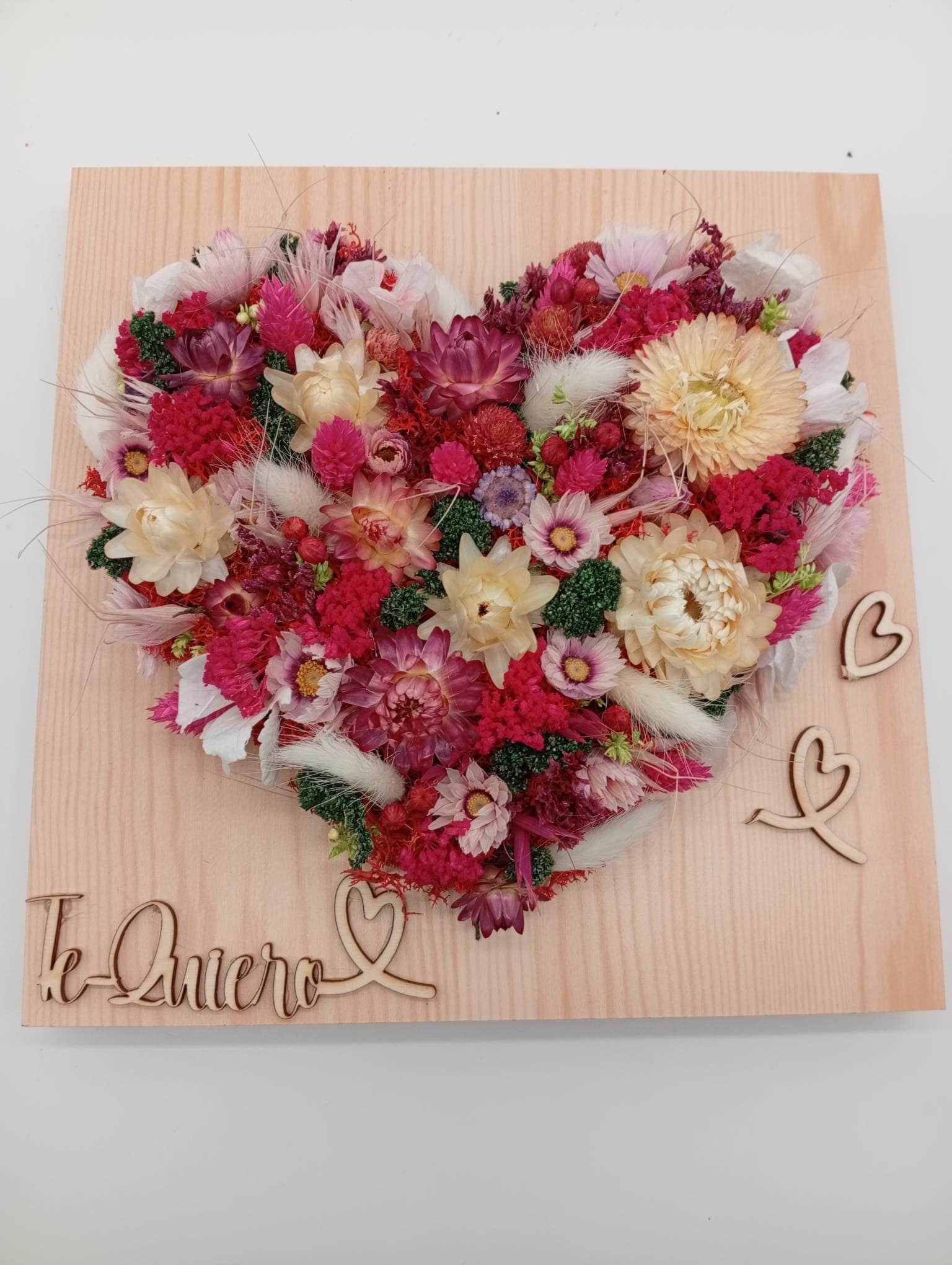 Qué bonito y delicada forma de decirle a alguien que te quiero con este producto.  Se trata de un marco de madera de 25 por 25 cm sobre el que sea realizado una composición preservada con forma de corazón. Para colocar de pie en cualquier rincón de tu casa o colgado en alguna pared.