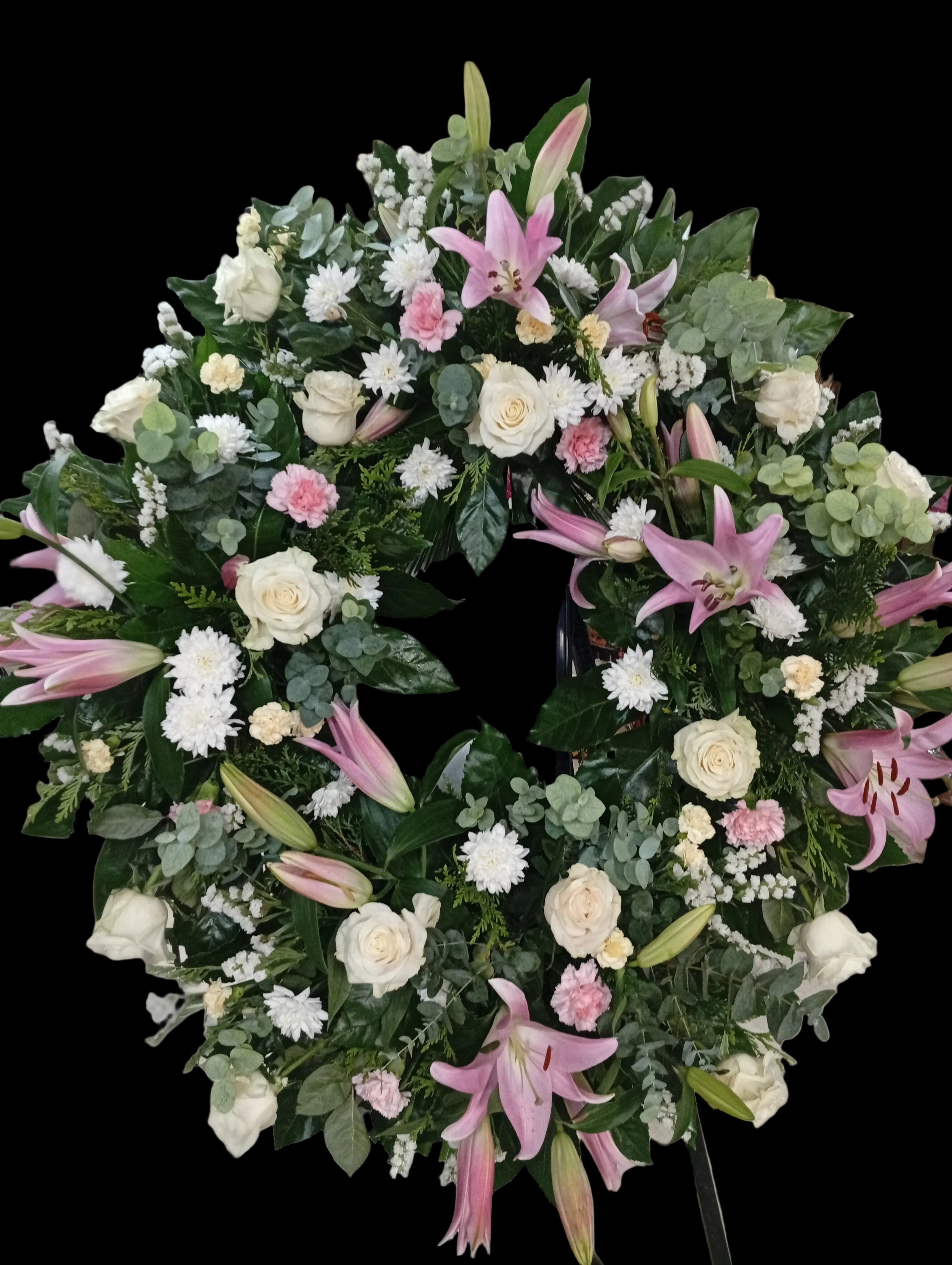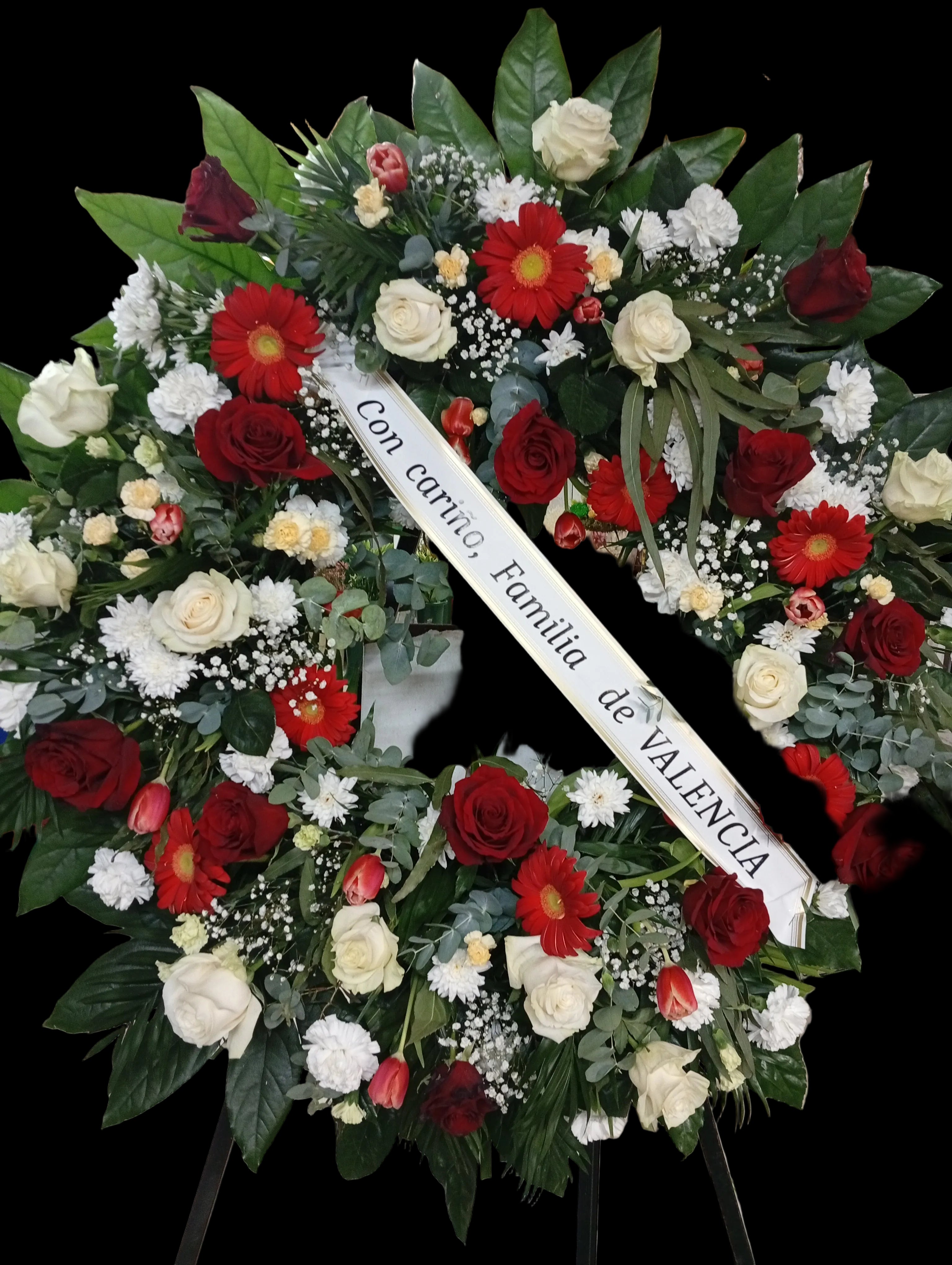 La corona 160, una variada pero elegante corona circular que puede añadir condolencias a un momento especial. Diseñada con buen gusto, esta corona es una manera perfecta de honrar la vida de un ser querido. Rosas y flores conforman este arreglo floral . Producto para recogida en tienda o entrega en tanatorio de la comarca de Valdeorras (ponte en contacto con nosotros en el 604 05 44 71)