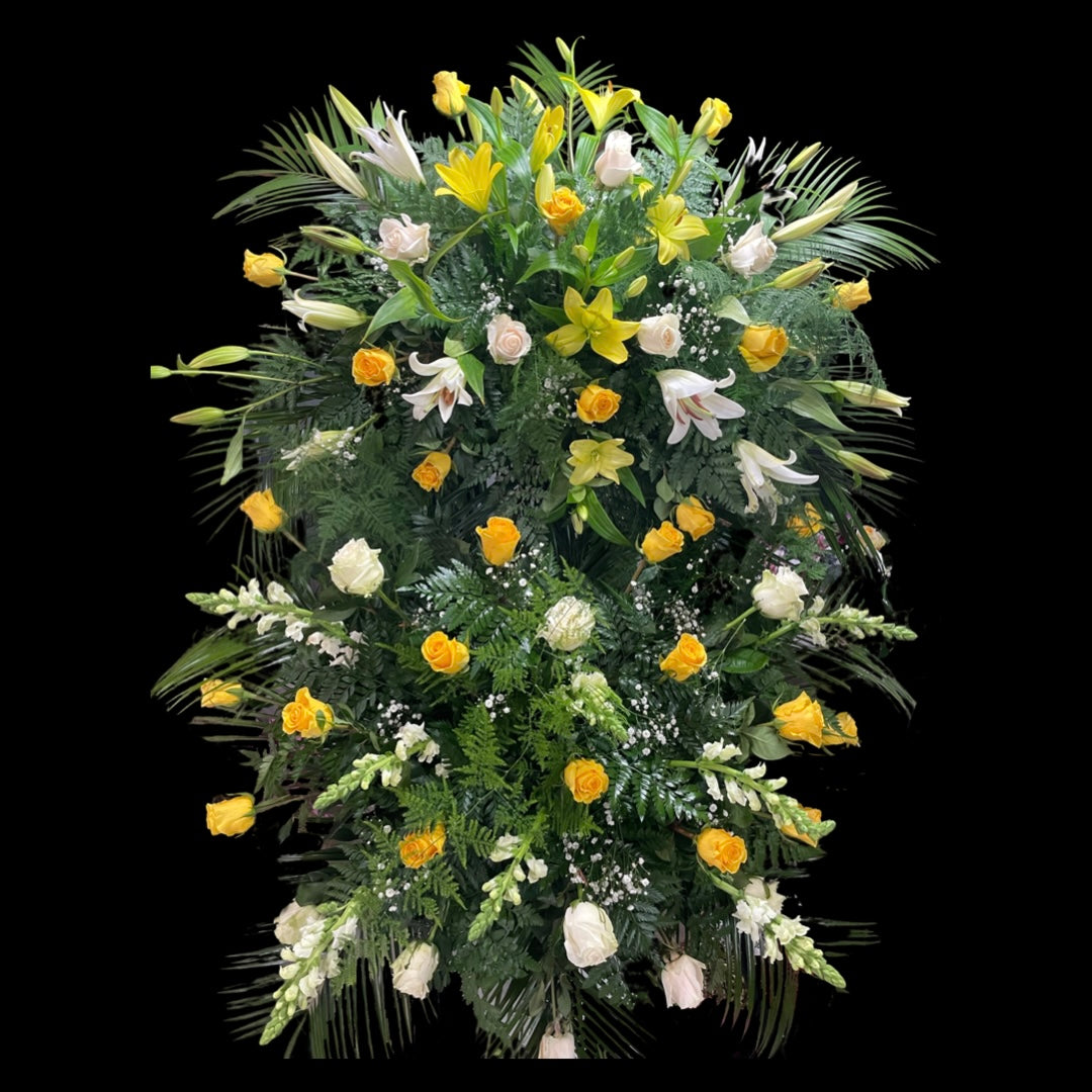 Nuestra Corona 160 es una creación única, compuesta por rosas, lilium y flor espigada. Esta impresionante combinación crea una obra de arte floral perfecta para cualquier ocasión. La Corona 160 es una visión única de la belleza floral. Producto para recogida en tienda o entrega en tanatorio de la comarca de Valdeorras (ponte en contacto con nosotros en el 604 05 44 71)