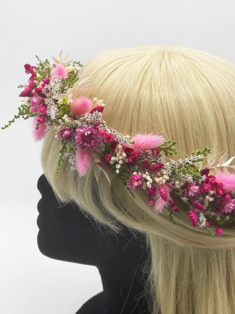 Corona sobre alambre dúctil que se adapta fácilmente al contorno de tu cabeza, elaborado con flor seca y preservada. En contacto con tu pelo, la corona lleva un lazo para evitar cualquier tipo de roce. En observaciones necesitaríamos que nos proporcionases información sobre el contorno deseado así cómo los colores a emplear. Las flores empleadas son hortensia preservada, glixia, paniculata, brooms y phalaris. Plazo de elaboración: 48/72 h