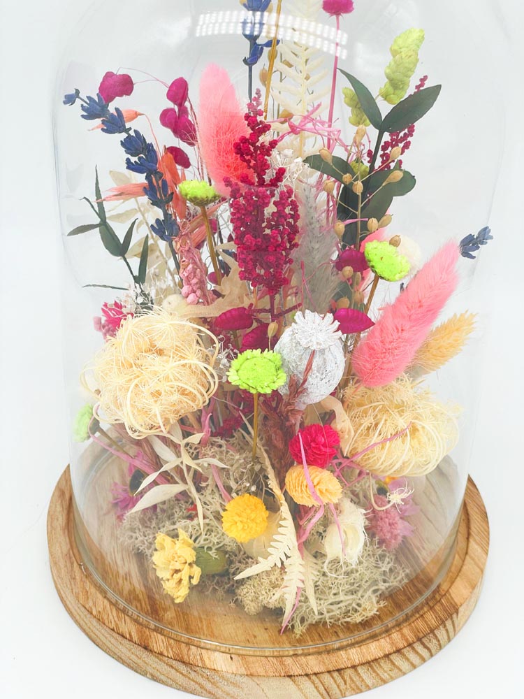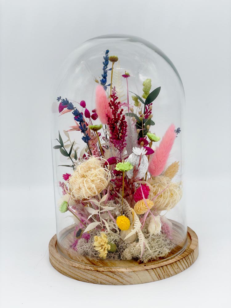 Toda la belleza y mágia de las flores secas y preservadas en una cúpula. Déjate sorprender y sorprende con nuestras creaciones. Puedes incluir una frase en la base de la cúpula. Plazo de elaboración: 48/72 h