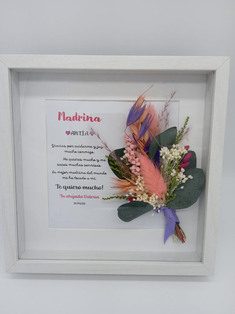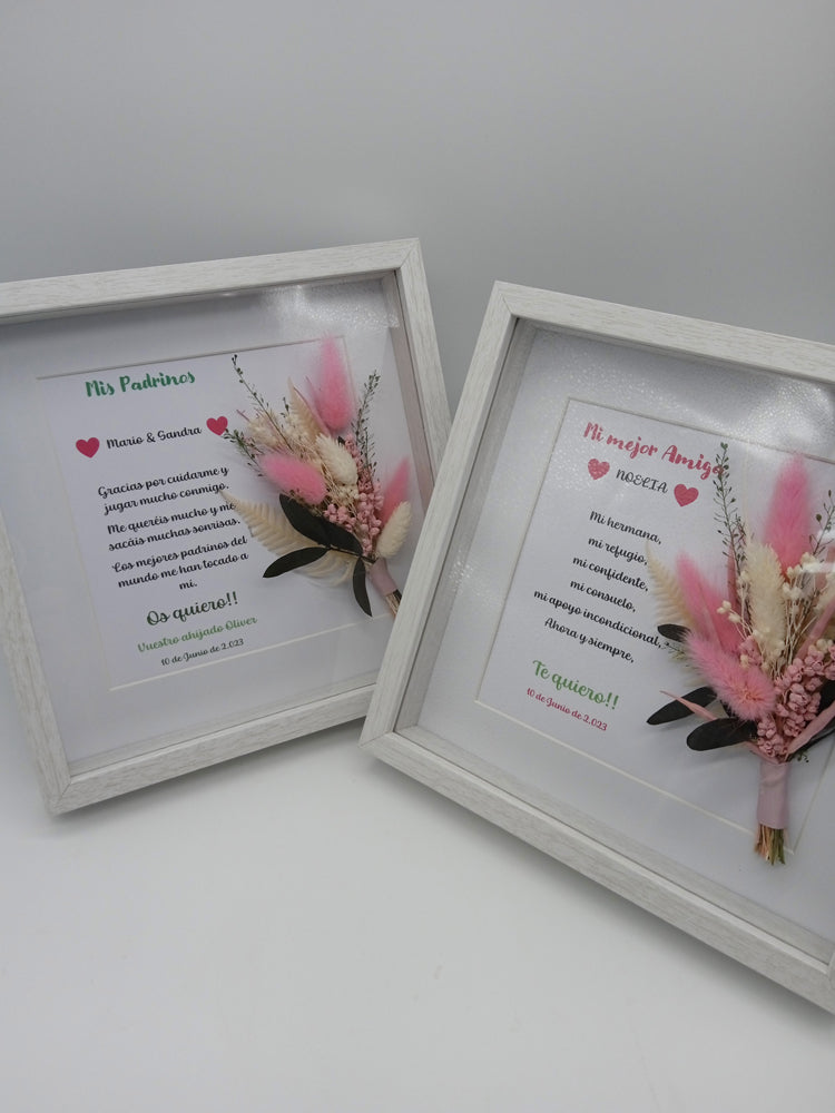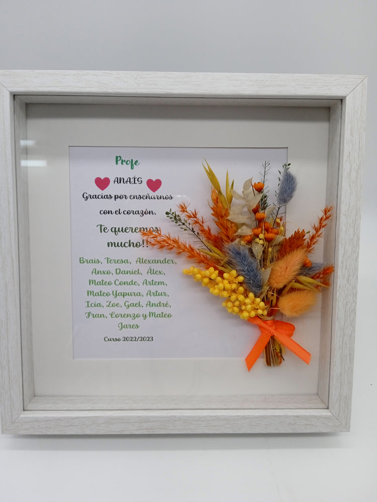 Las palabras que siempre quisiste decir y que no quieres que se olviden nunca. Nuestro marco con fondo en madera es ideal para recoger frases emotivas acompañadas de un pequeño ramo preservado. Nos puedes indicar el texto que quieres incorporar en el apartado de observaciones que aparecerá al finalizar el proceso de compra. También te puedes poner en contacto con nosotros a través de nuestro teléfono 604 05 44 71 o email xardinalia@xardinalia.es. Plazo de elaboración: 48/72 h
