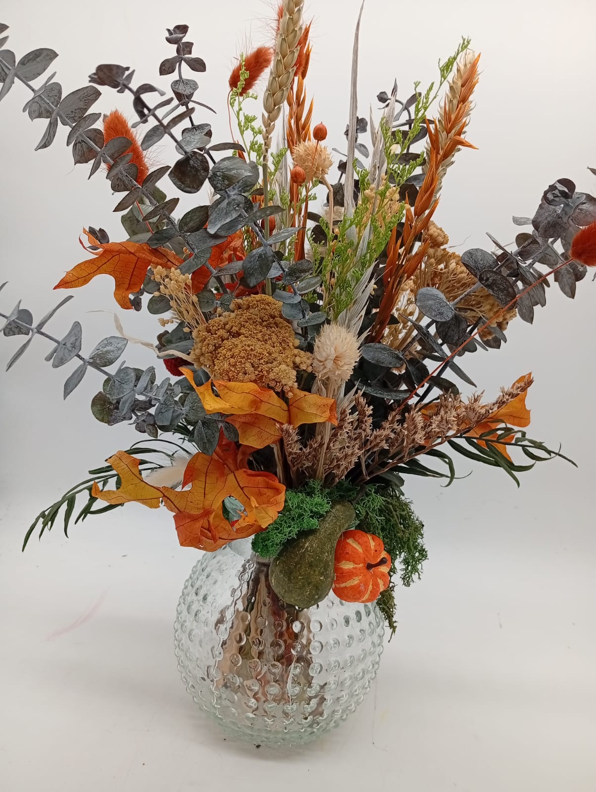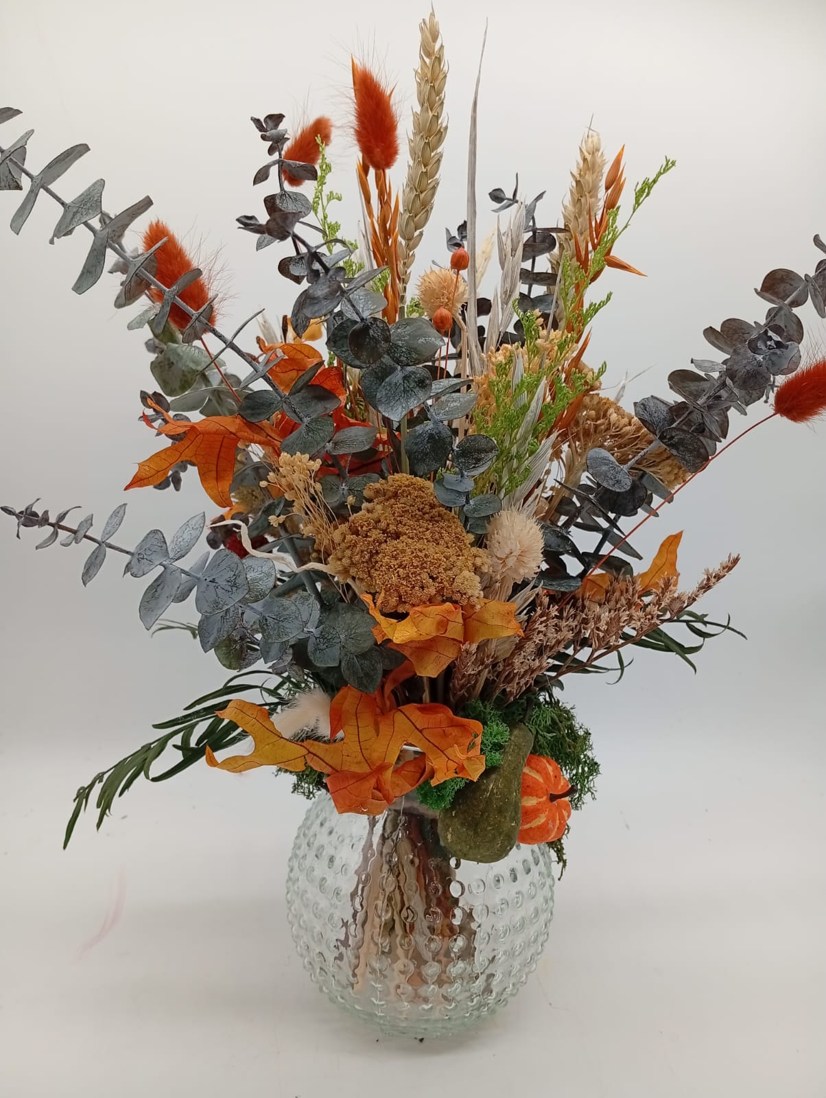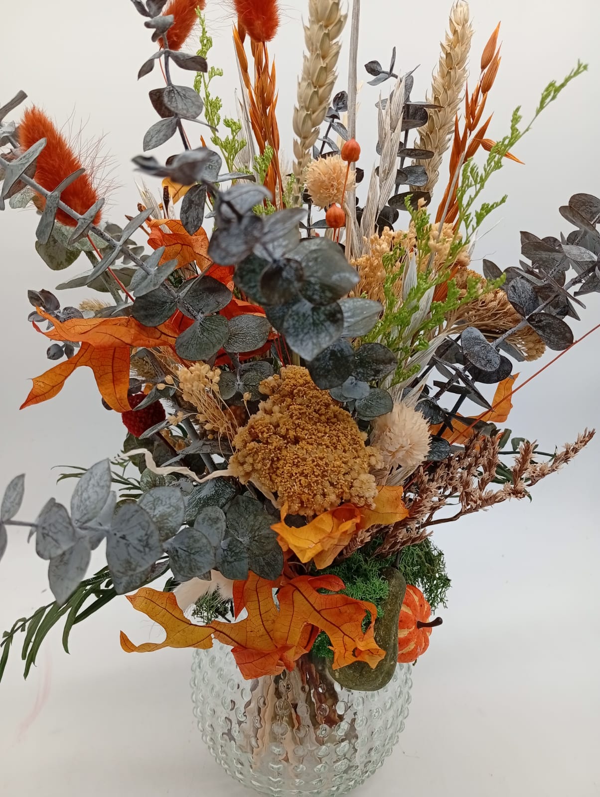 Si tu presupuesto es muy ajustado pero regalar flores preservadas o tener flores preservadas en casa sigue siendo una opción, este es tu producto. El conjunto del jarrón de cristal y el arreglo floral tiene una altura de unos 40 cm aproximadamente.  Se trata de un ramo de eucalipto preservado acompañado por diferentes flores preservadas de carácter silvestre: espigas, lagurus, brooms ... La base es un coqueto jarrón de cristal transparente que va bien en cualquier ambiente. Un trabajo artesano confeccionado en Galicia con nuestras manitas. Plazo de elaboración: 2/3 días laborables