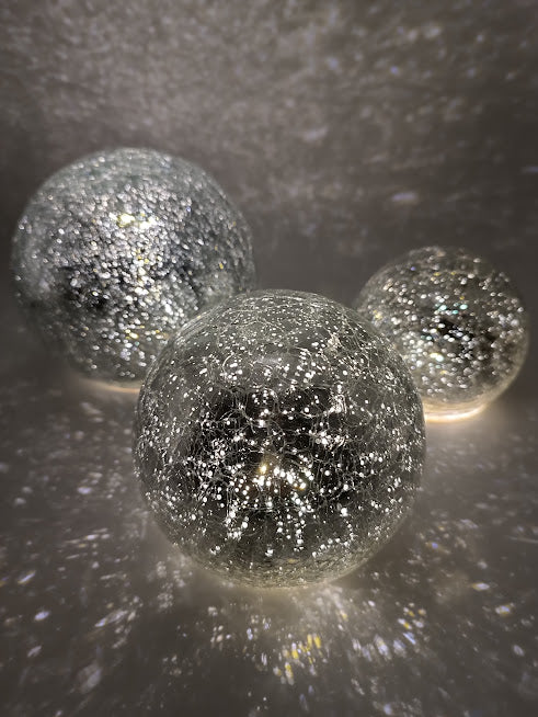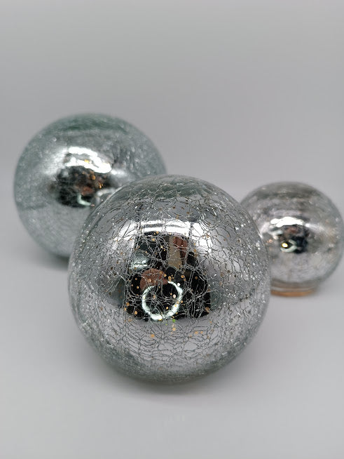 Lámparas / esferas plateadas con luz led blanca fría y temporizador. Medidas: Grande: Ø 15 cm x 14 H / Mediana: Ø 13 x 12 H / Pequeña: Ø 10 x 9 H Pilas incluídas