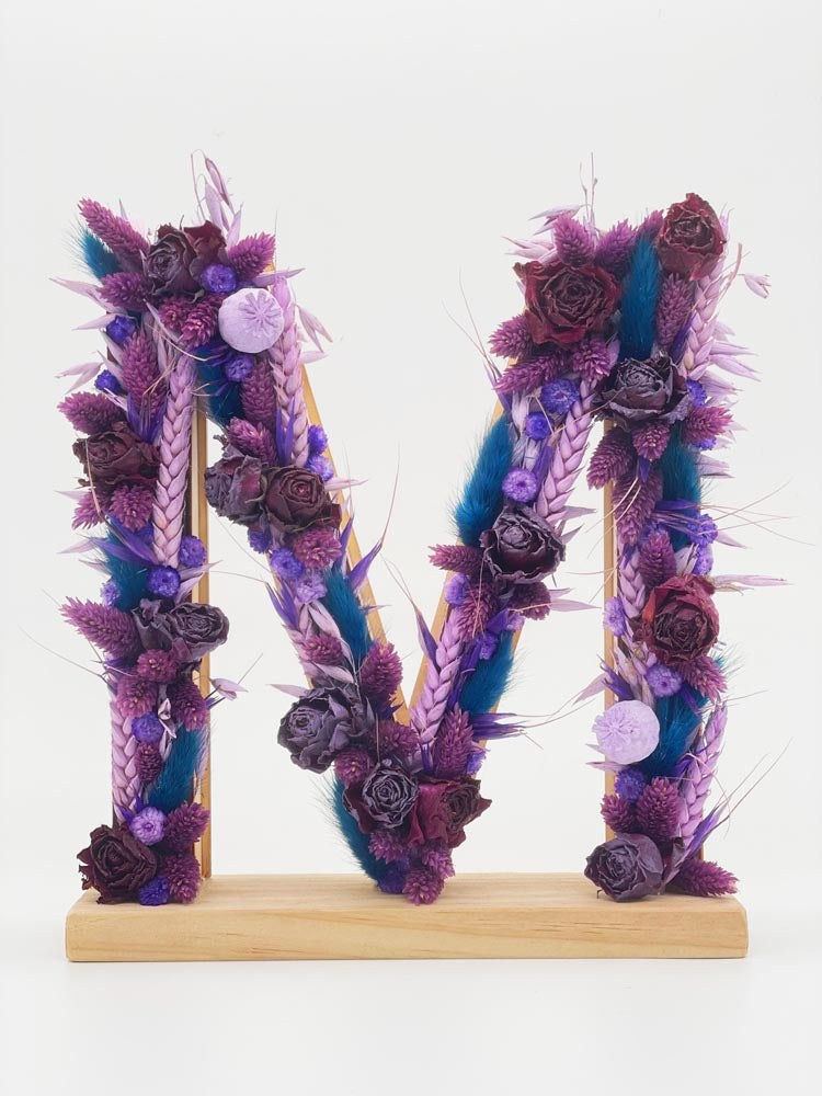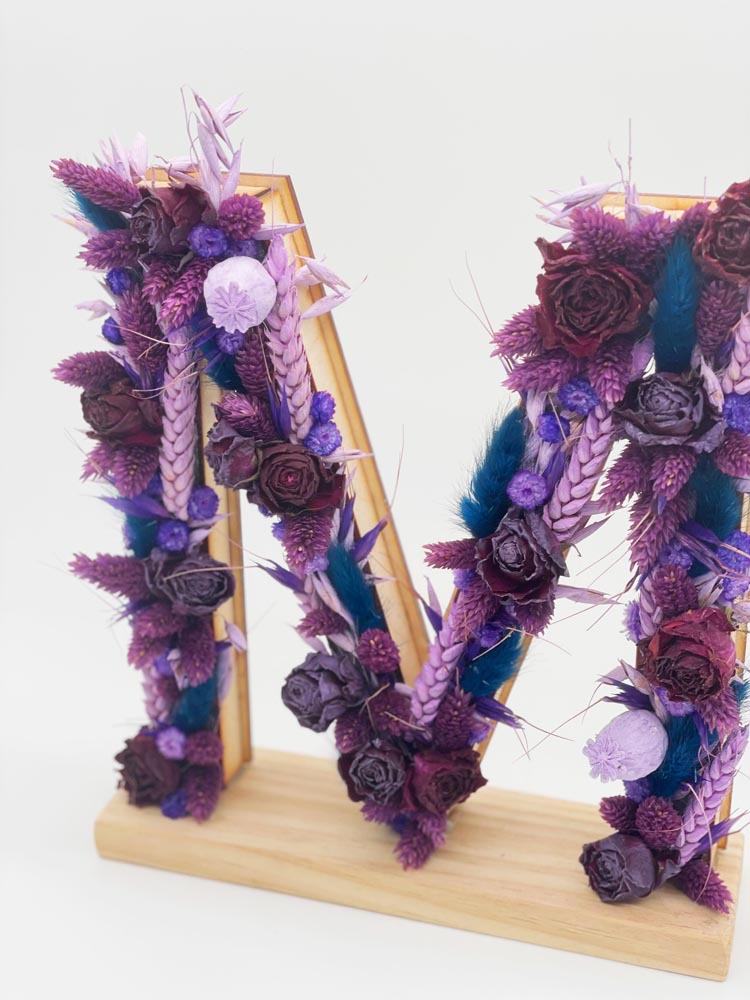 Silueta de madera con la inicial o número que prefieras sobre peana de madera lo que le aporta gran estabilidad. El color del trabajo floral lo puedes escoger tú e, incluso, añadir un nombre en vinilo o frase corta para que podamos colocarla en la base. Plazo de elaboración: 48/72 h