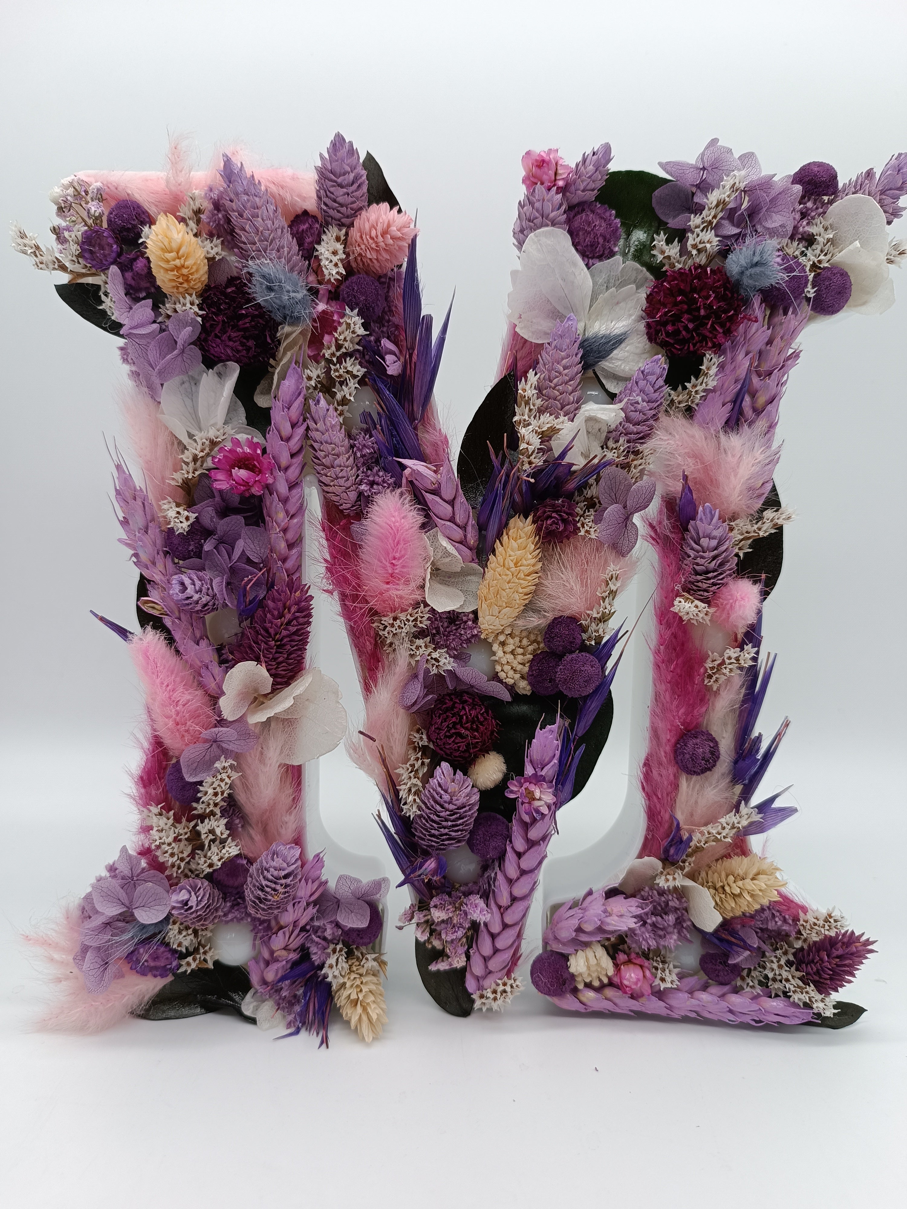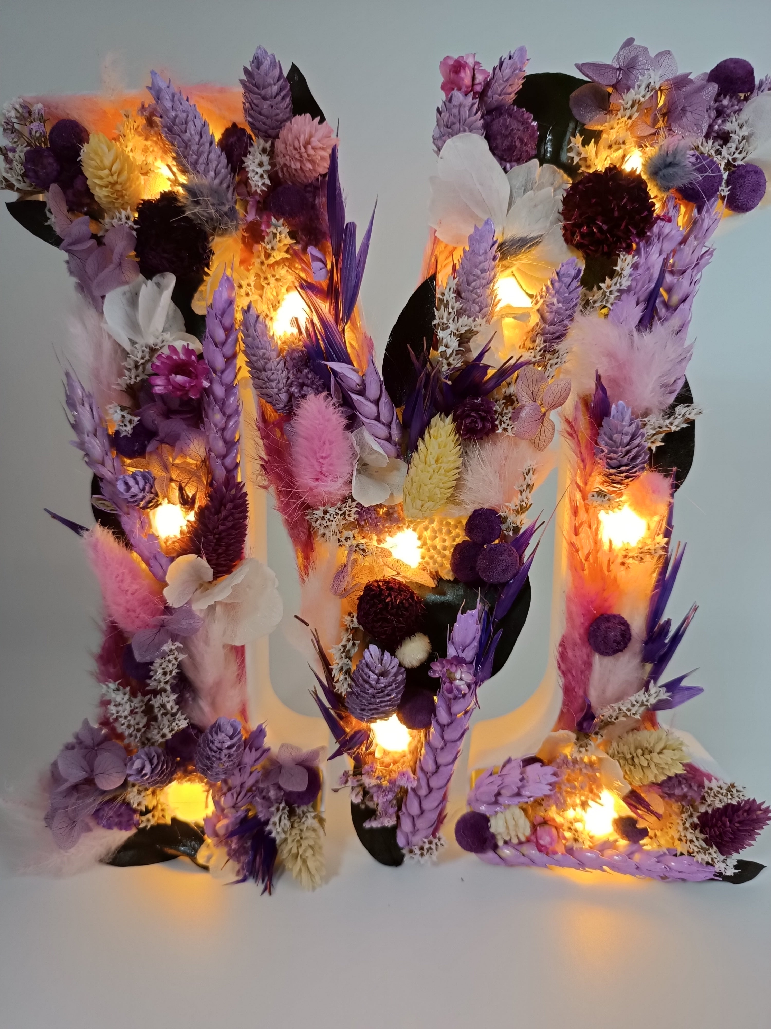 Silueta en pvc con la inicial que prefieras muy estable con luces que funcionan con pilas, sí incluidas. El color del trabajo floral lo escoges tú. Plazo de elaboración: 48/72 h