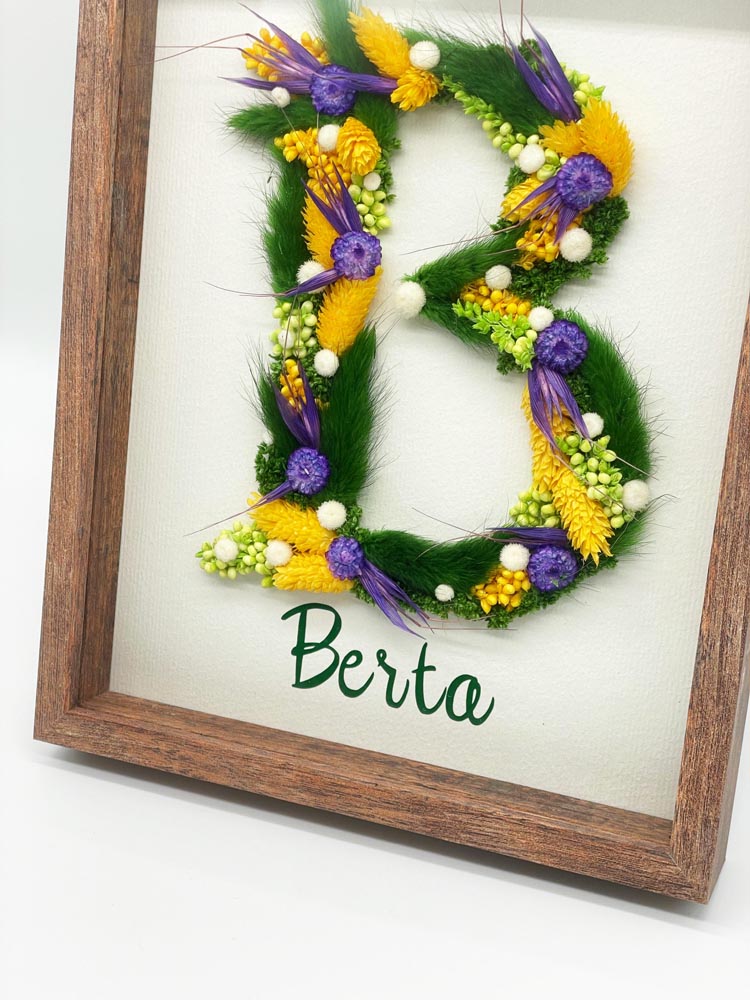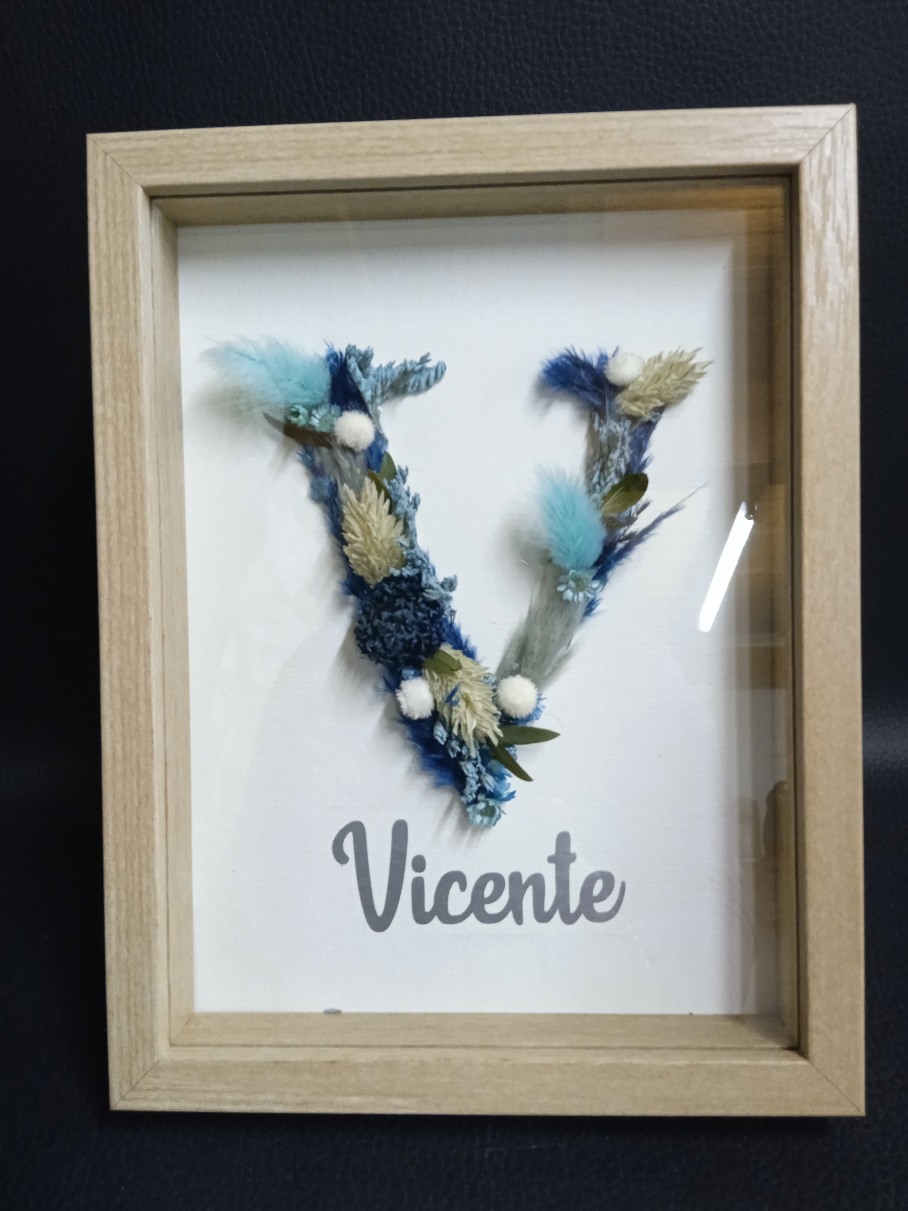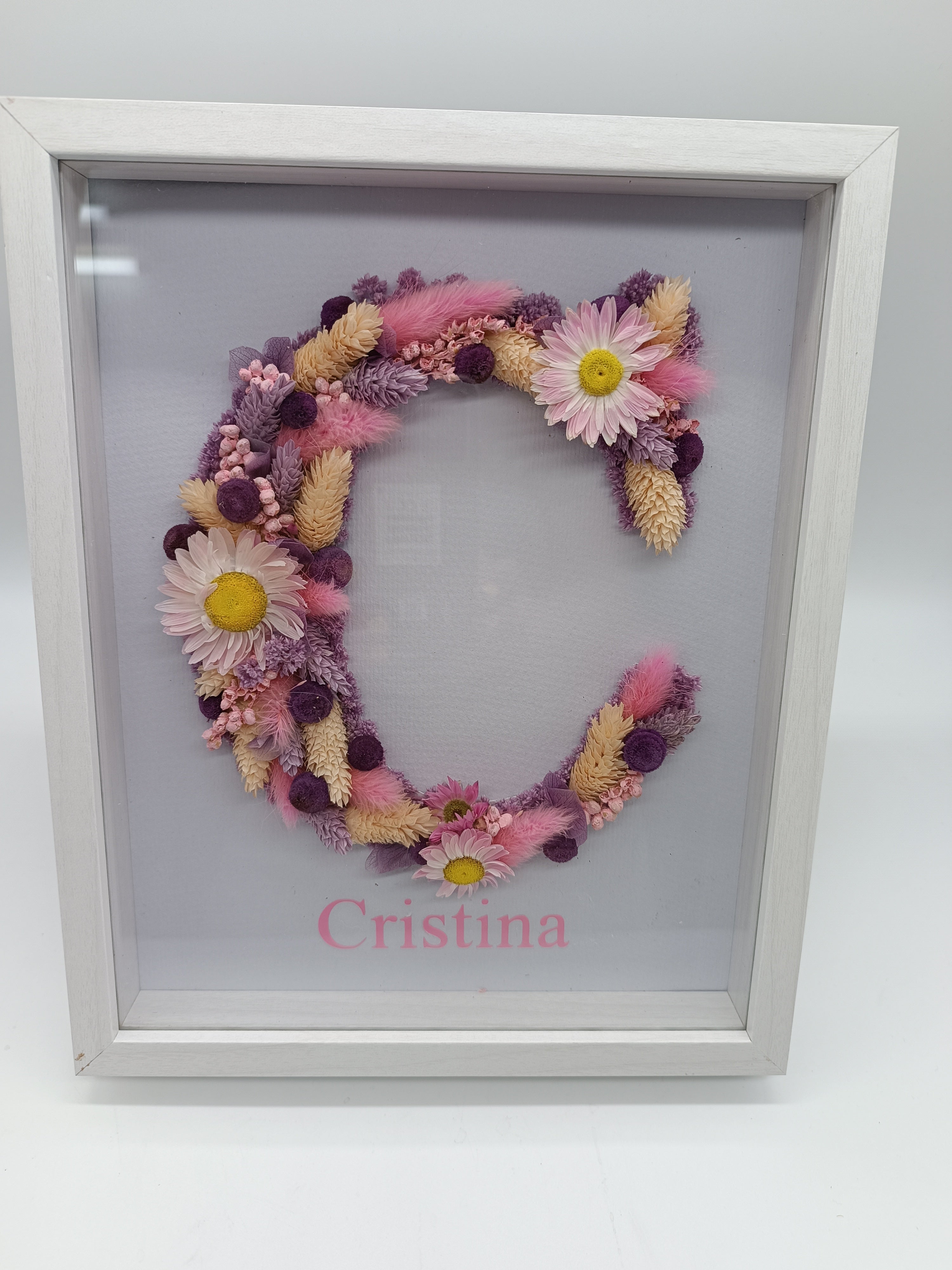 Letra elaborada con flor preservada y seca. Presentada en marco de madera. Personalizable con el nombre. Medidas: 25 x 30 cm Indícanos en observaciones que tono te gustaría (rosado, azulado, lilas, naranjas, verdes o rojos), así cómo si quieres incluir el nombre correspondiente a la inicial. Plazo de elaboración: 48/72 h
