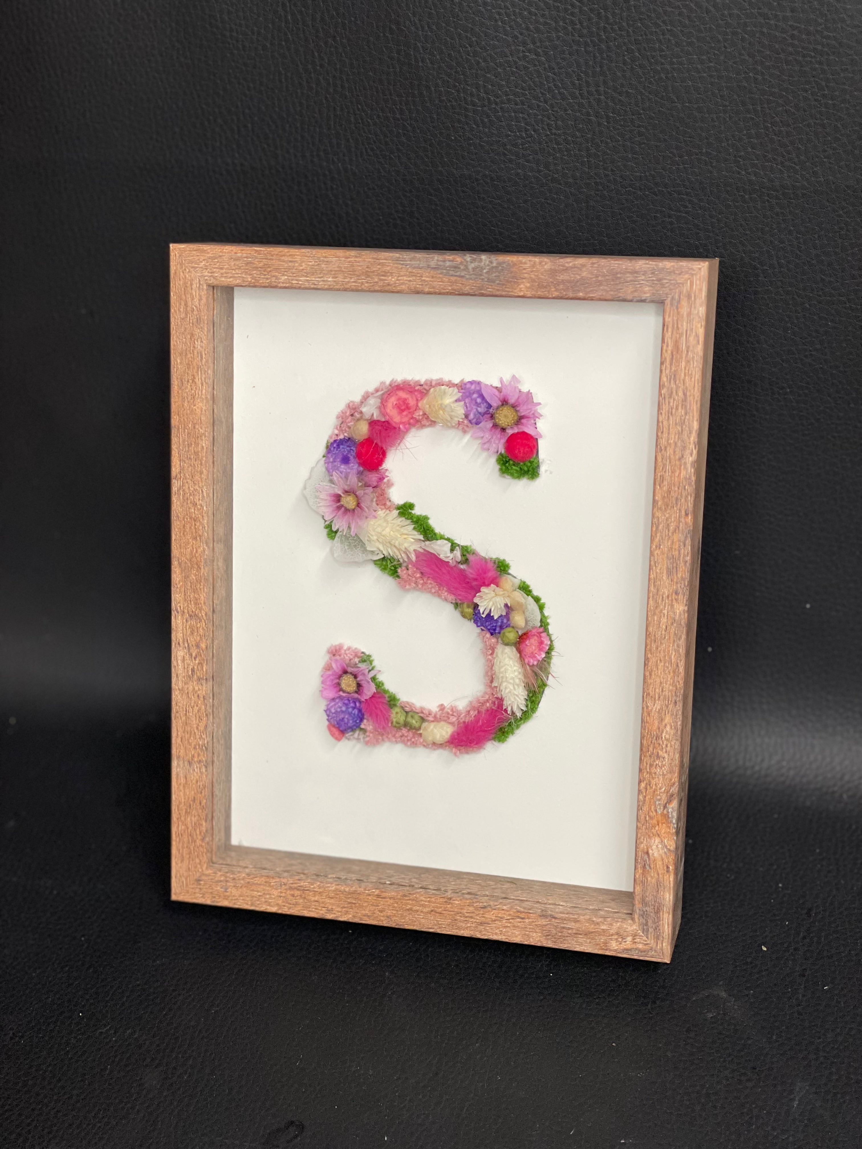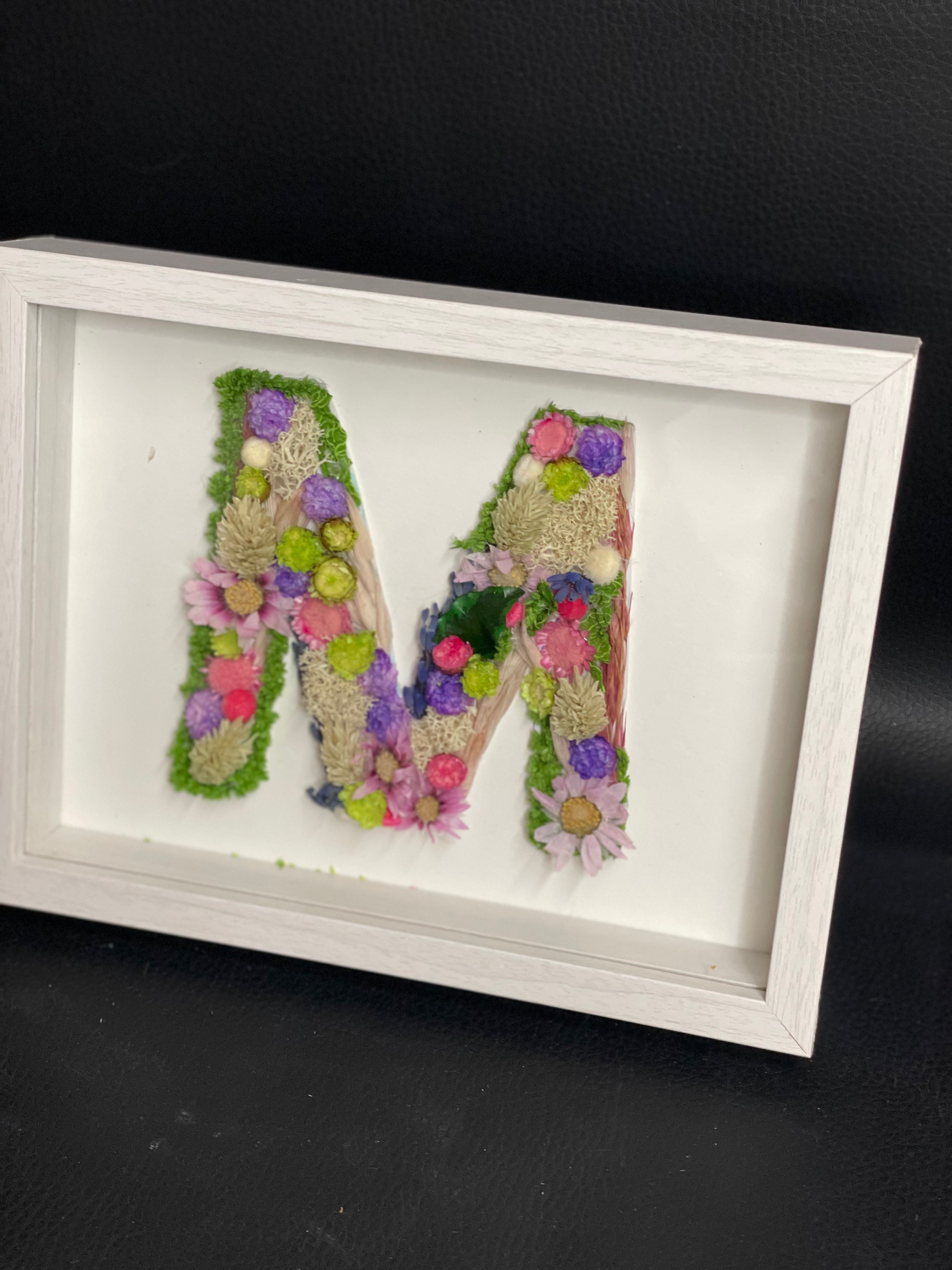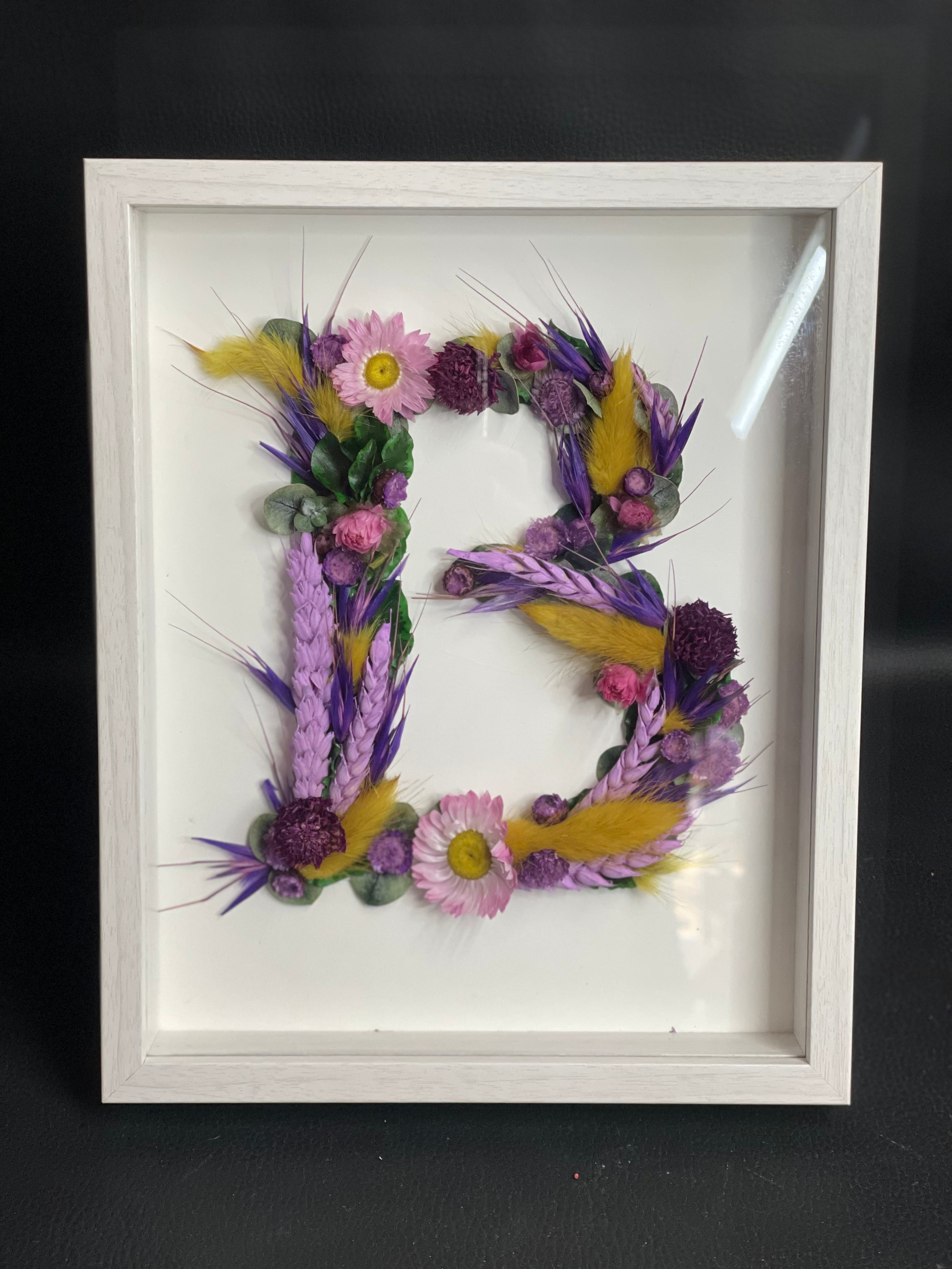 Letra elaborada con flor preservada y seca. Presentada en marco de madera. Personalizable con el nombre. Medidas: 25 x 30 cm Indícanos en observaciones que tono te gustaría (rosado, azulado, lilas, naranjas, verdes o rojos), así cómo si quieres incluir el nombre correspondiente a la inicial. Plazo de elaboración: 48/72 h