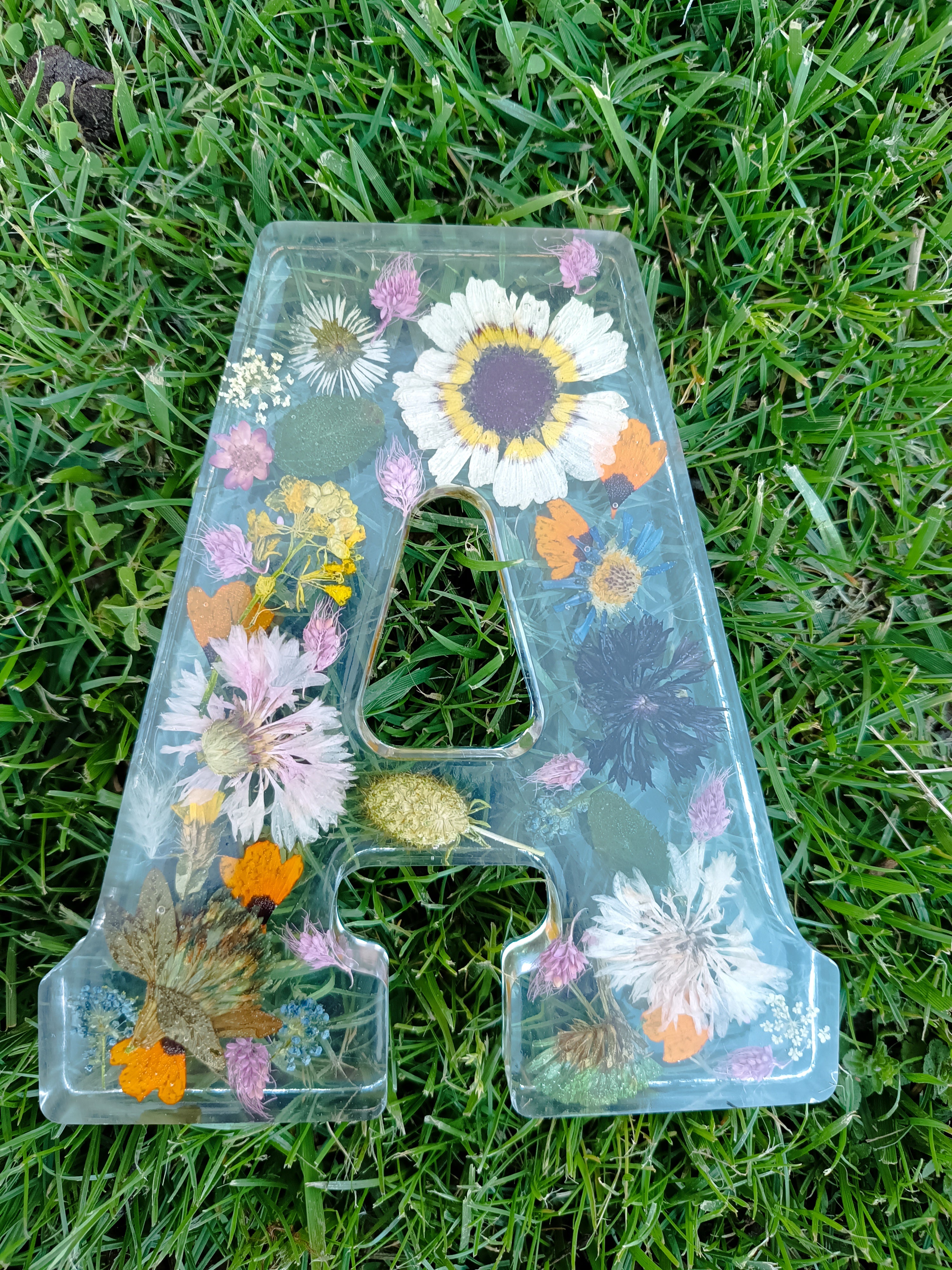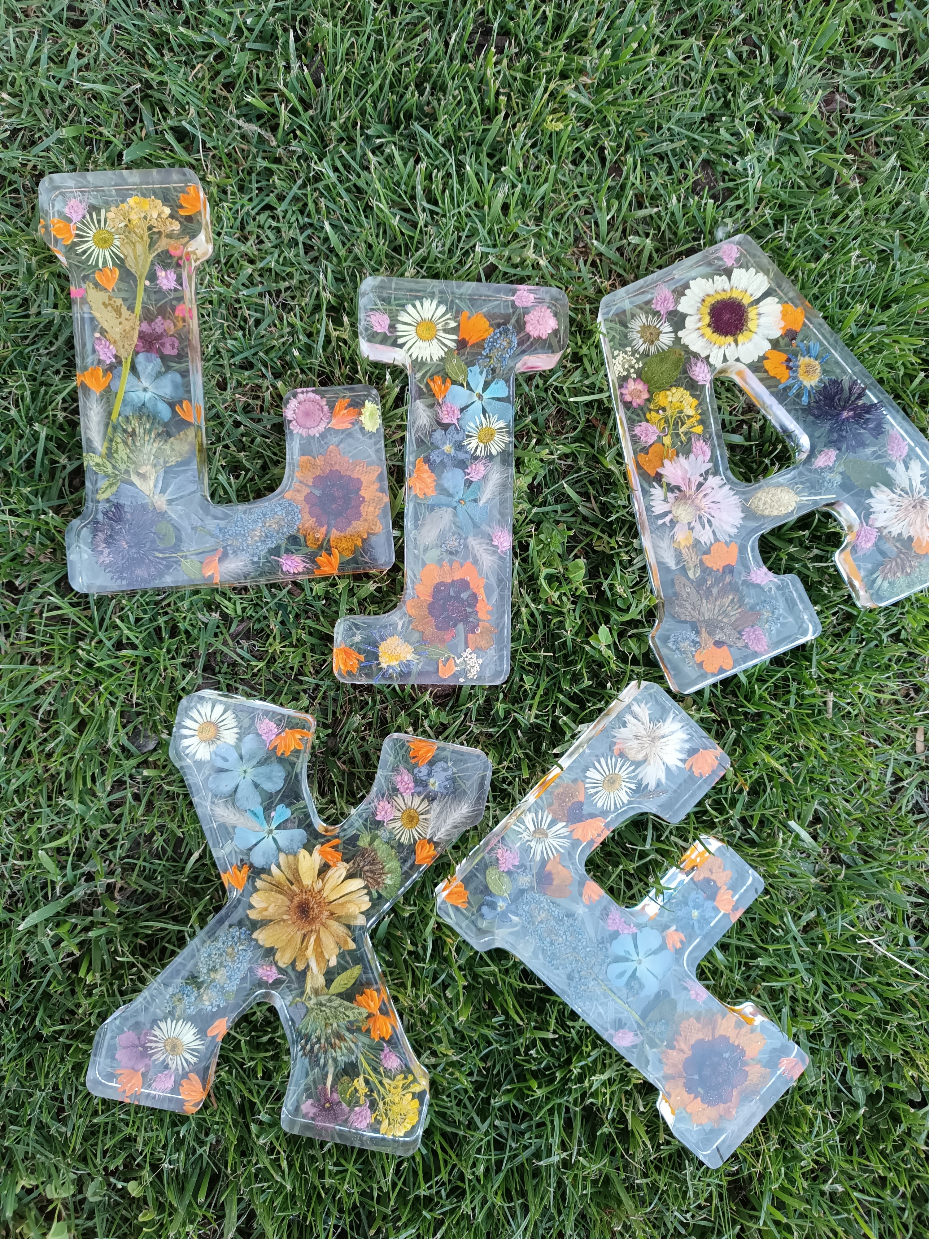 Letra de resina decorada con flores secas y prensadas en su interior. La altura de la letra es de 16 cm y el ancho varía según la letra. El tiempo de elaboración es de 15/21 días para asegurar la correcta curación de la resina.