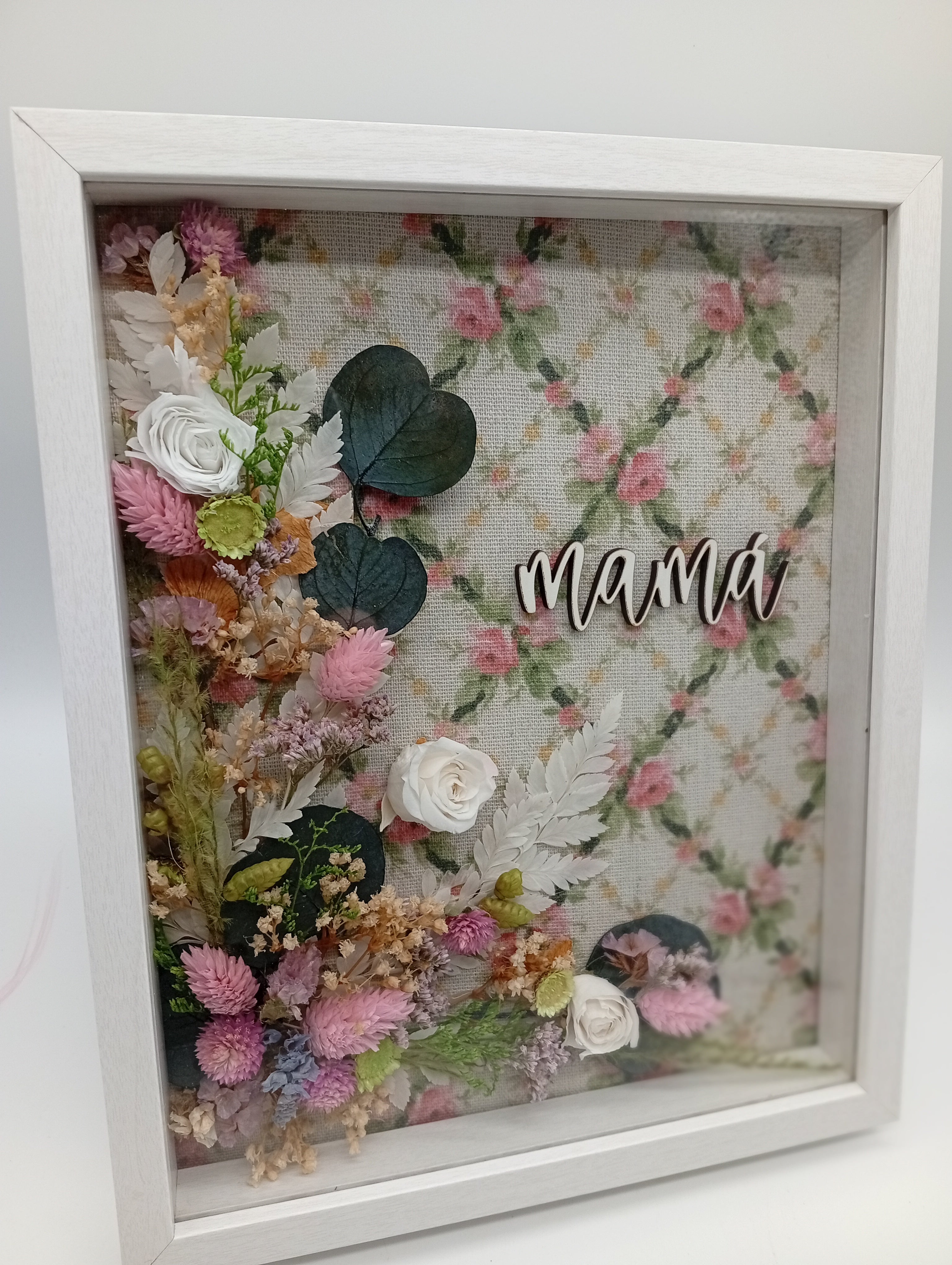 El marco floral Mamá es una auténtica cucada. Se trata de un marco de madera de 25 x 20 cm con profundidad de 2 cm. El fondo está decorado con preciosa tela que recuerda al tiempo de las abuelas. Lo acompaña un delicado trabajo floral elaborado con flor seca y preservada y un bonito "Mamá" en madera.