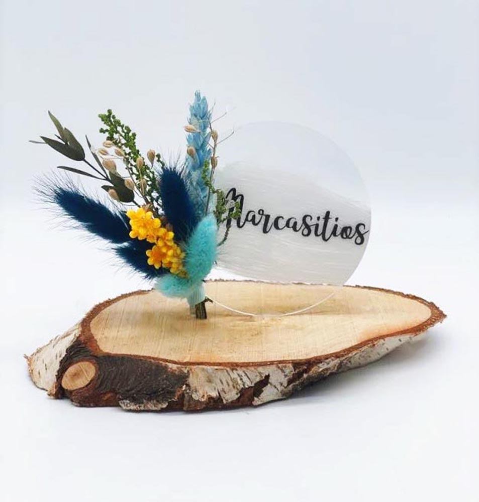 Placa redonda de metacrilato de 8 cm de diámetro acompañado de detalle en flor preservada y seca en las tonalidades que tú nos indiques. El nombre se adjunta en vinilo permanente. Pequeños detalles que marcan la diferencia. Pedido mínimo: 6 unidades Plazo de elaboración: 48/72 h