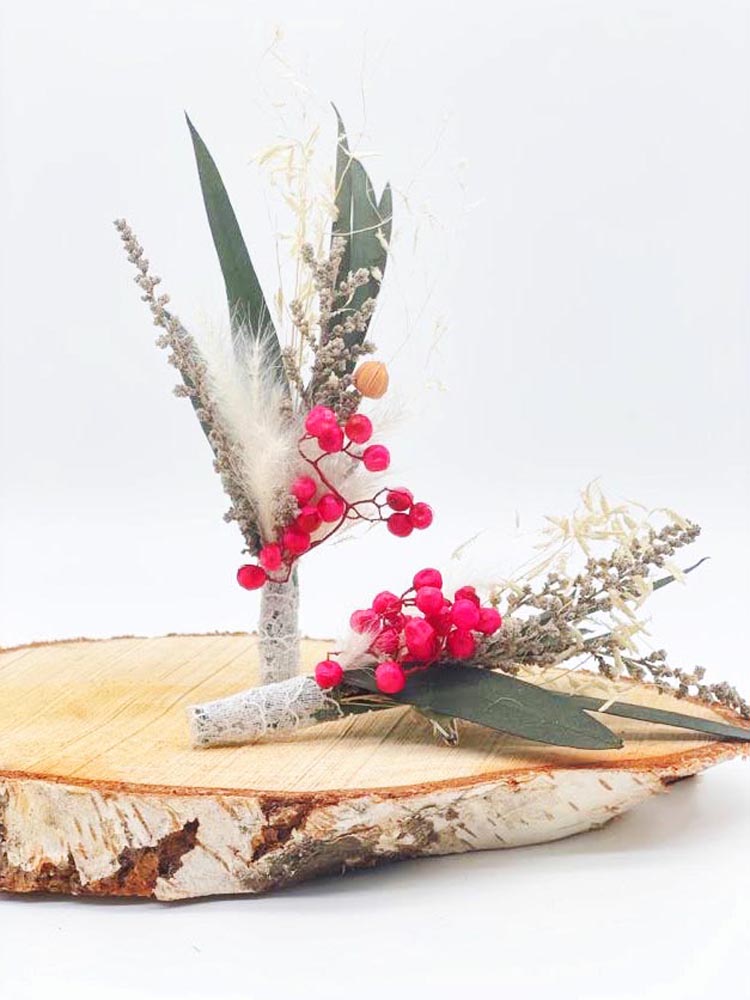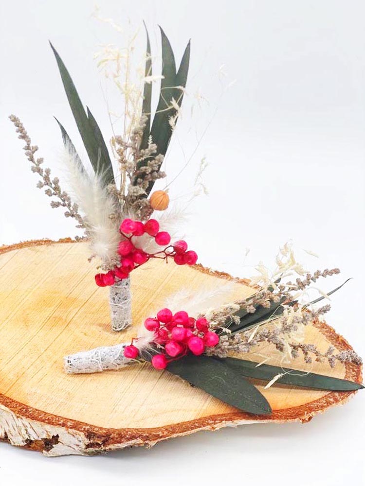 Los prendidos son una versión en miniatura del ramo de la novia. En ceremonia, lo suelen llevan el padrino/madrina y el novio/novia (pero estos dos ya te los regalamos con tu ramo).Si quieres agasajar a tus invitados con una miniatura de tu ramo en forma de prendido, este producto es lo que estás buscando.