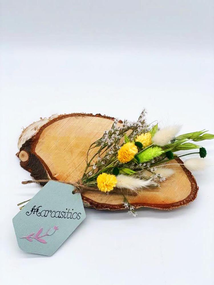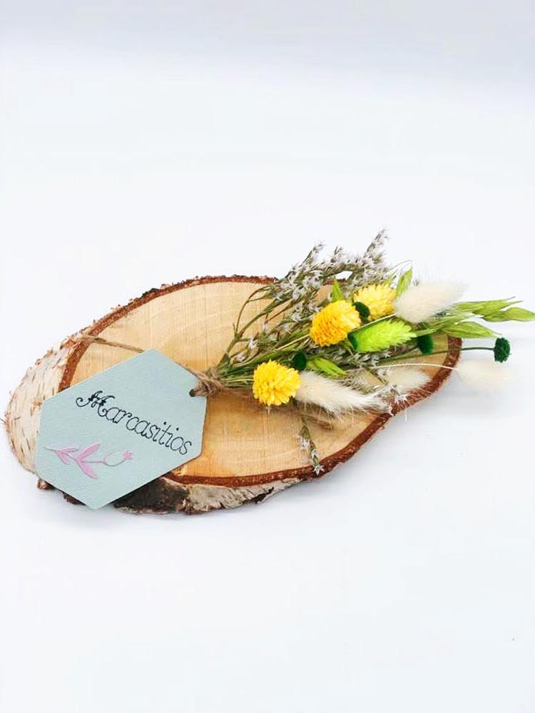Placa redonda de metacrilato de 8 cm de diámetro acompañado de detalle en flor preservada y seca en las tonalidades que tú nos indiques. El nombre se adjunta en vinilo permanente. Pequeños detalles que marcan la diferencia. Pedido mínimo: 6 unidades