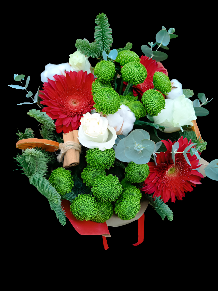 Rojo, verde y blanco, son los colores que definen nuestro ramo de invierno. Naranja, algodón y canela acompañan al resto de flores, impregnando con su aroma invernal cualquier estancia. Para que la flor sea lo más fresca posible deberás encargarlo con dos/tres días de antelación a su entrega.