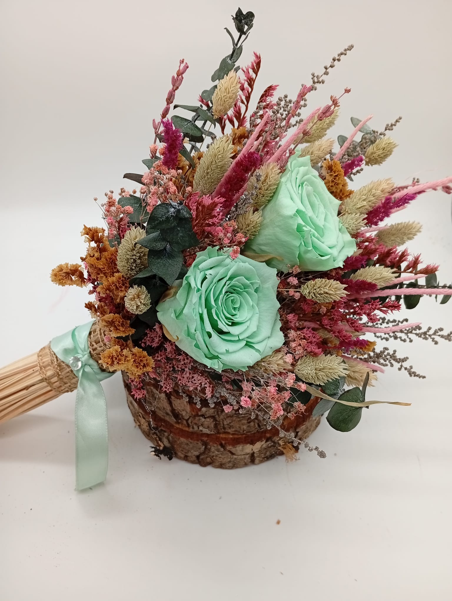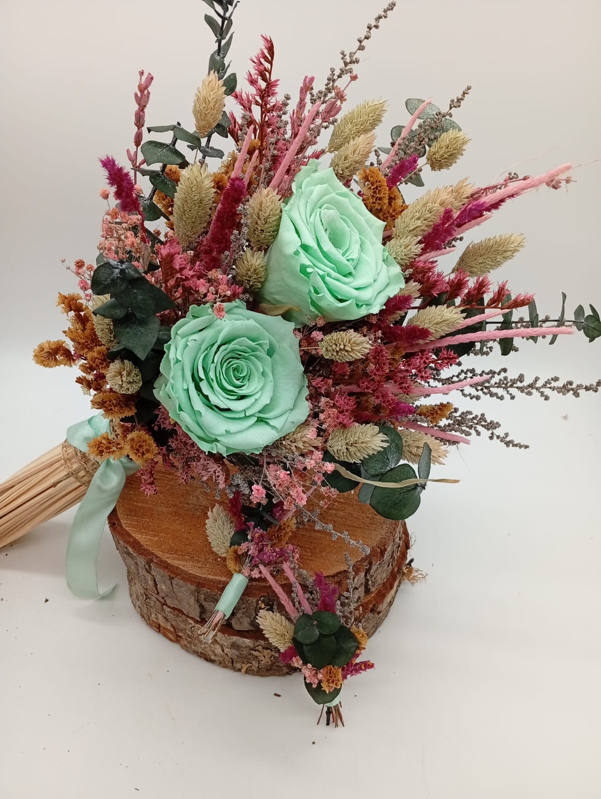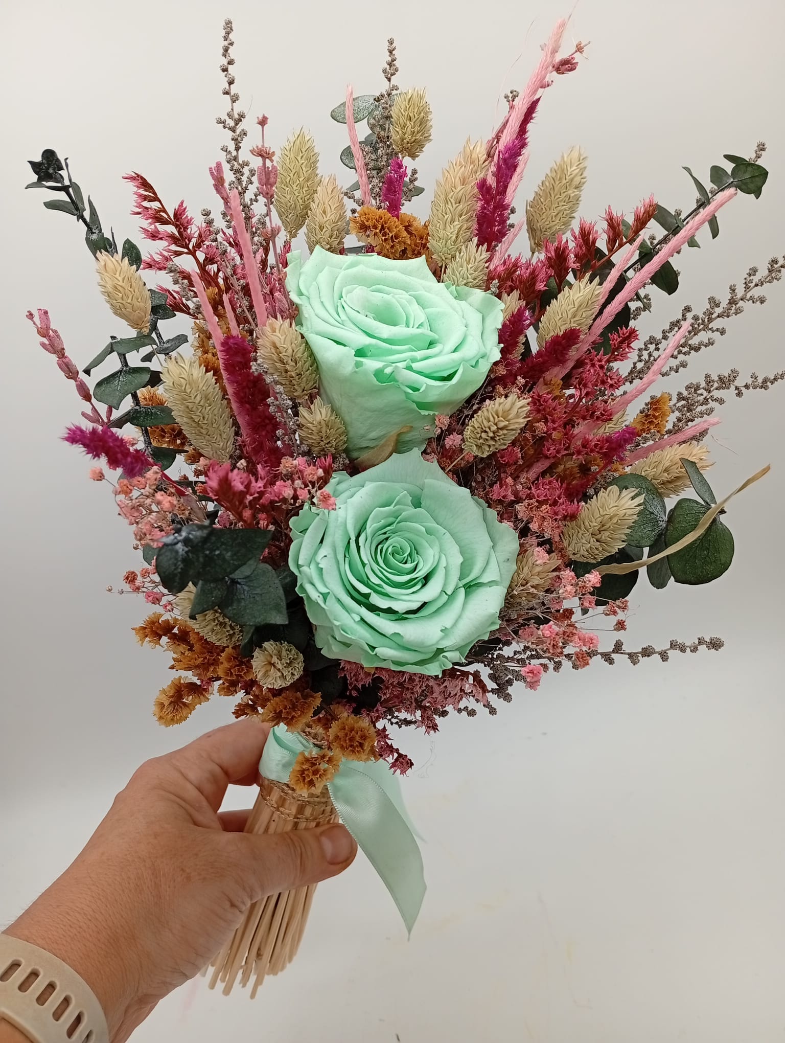 En Karina lo primero que atrae la atención son las dos rosas verde menta; atrapan todas las miradas. Es un ramo que no entiende de complejos en lo referente al color, composición y estructura. Phalaris, limonium, Brooks, paniculat, eucalipto, lavanda y avena acompañan de forma atrevida y armoniosa a las dos rosas protagonistas de este ramo. Se puede realizar en otras tonalidades.Incluye un prendido a juego para el novio o padrino. Tiempo de confección desde su definición siete días laborables.