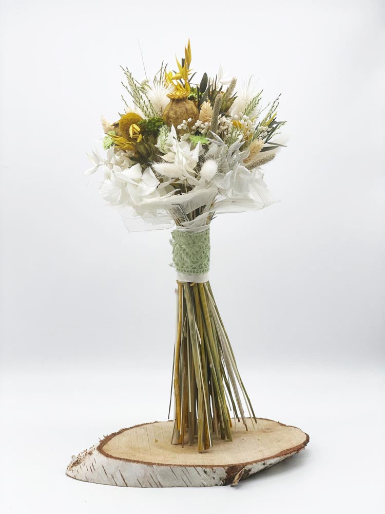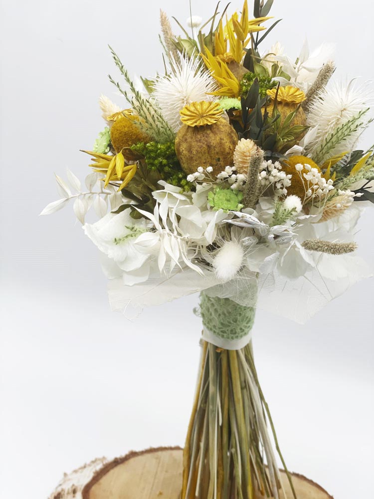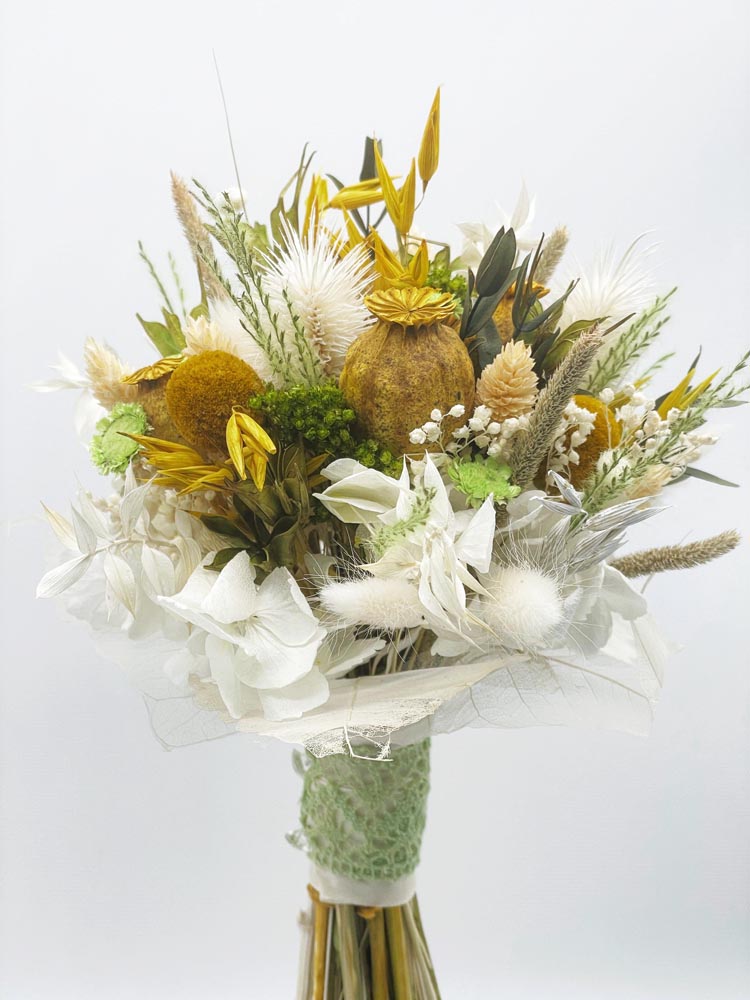 Meniño es el pequeño de los ramos en bouquet. Elaborado con hortensia, cardo, papaver y phalaris principalmente en tonos cítricos. Muy fresquito y fácil de llevar