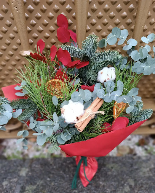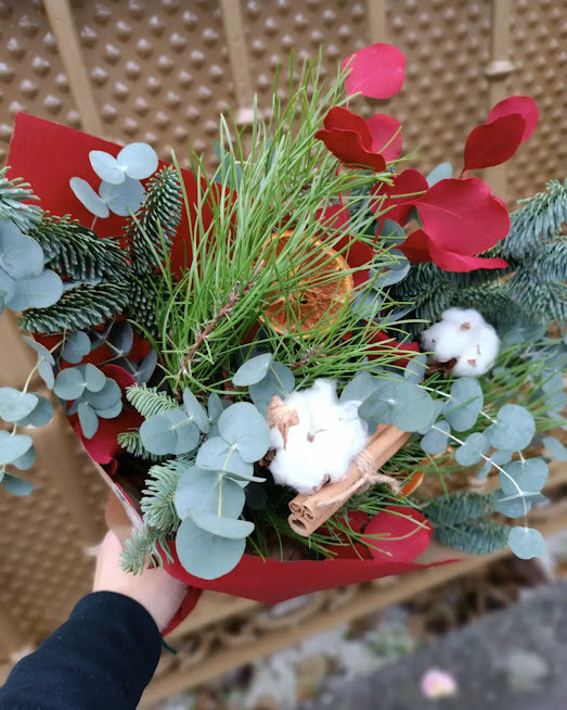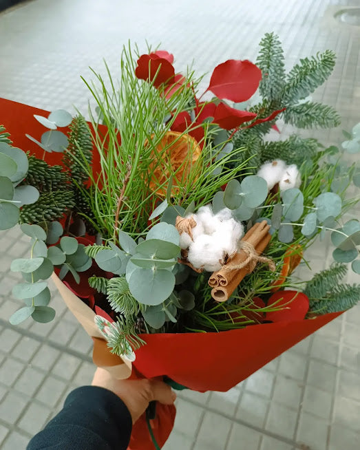 Lleva la Navidad a tu casa con esta composición de abeto, eucalipto y pino acompañados por canela, flores de algodón y naranja deshidratada. Te va a enamorar!!