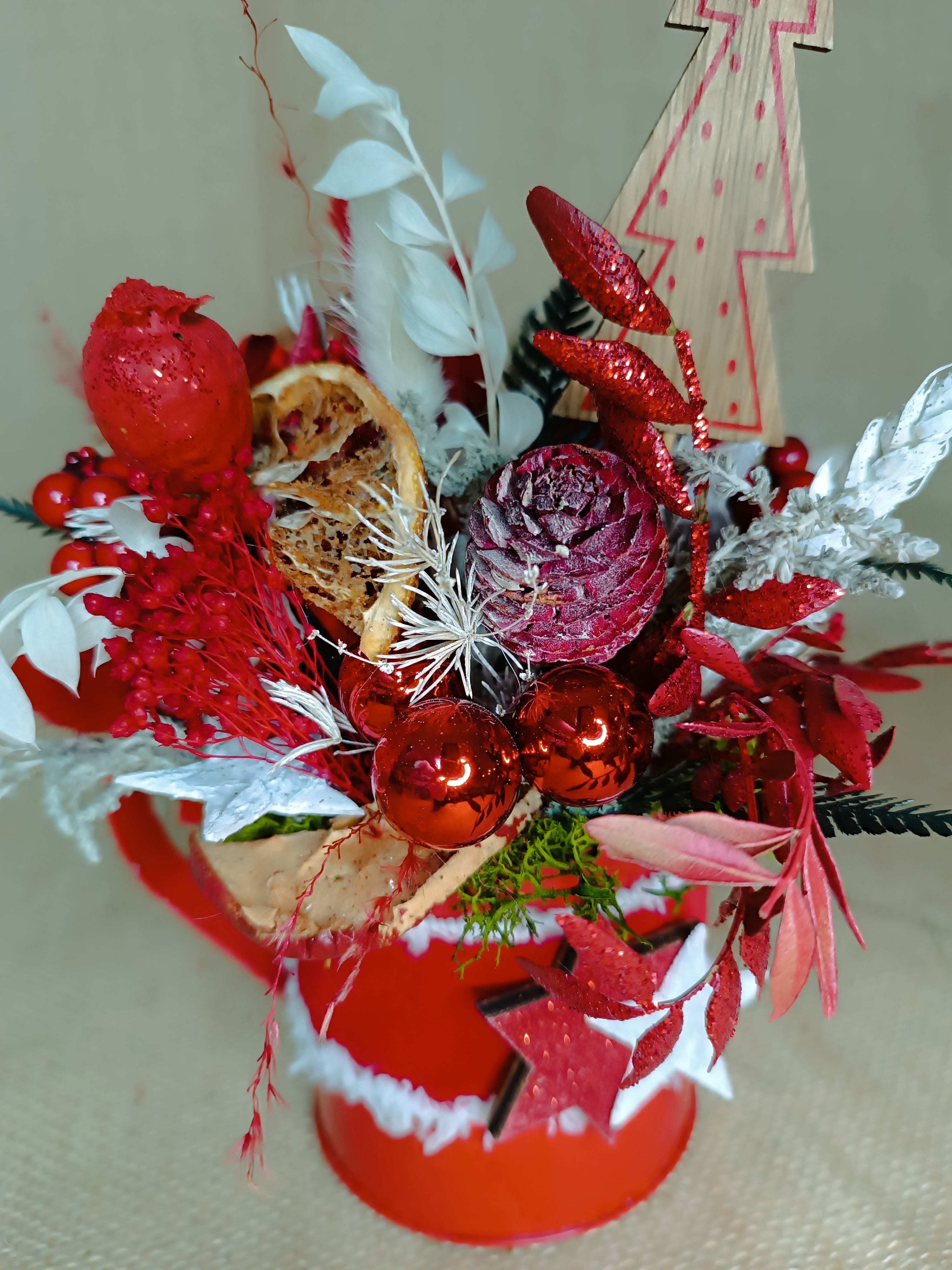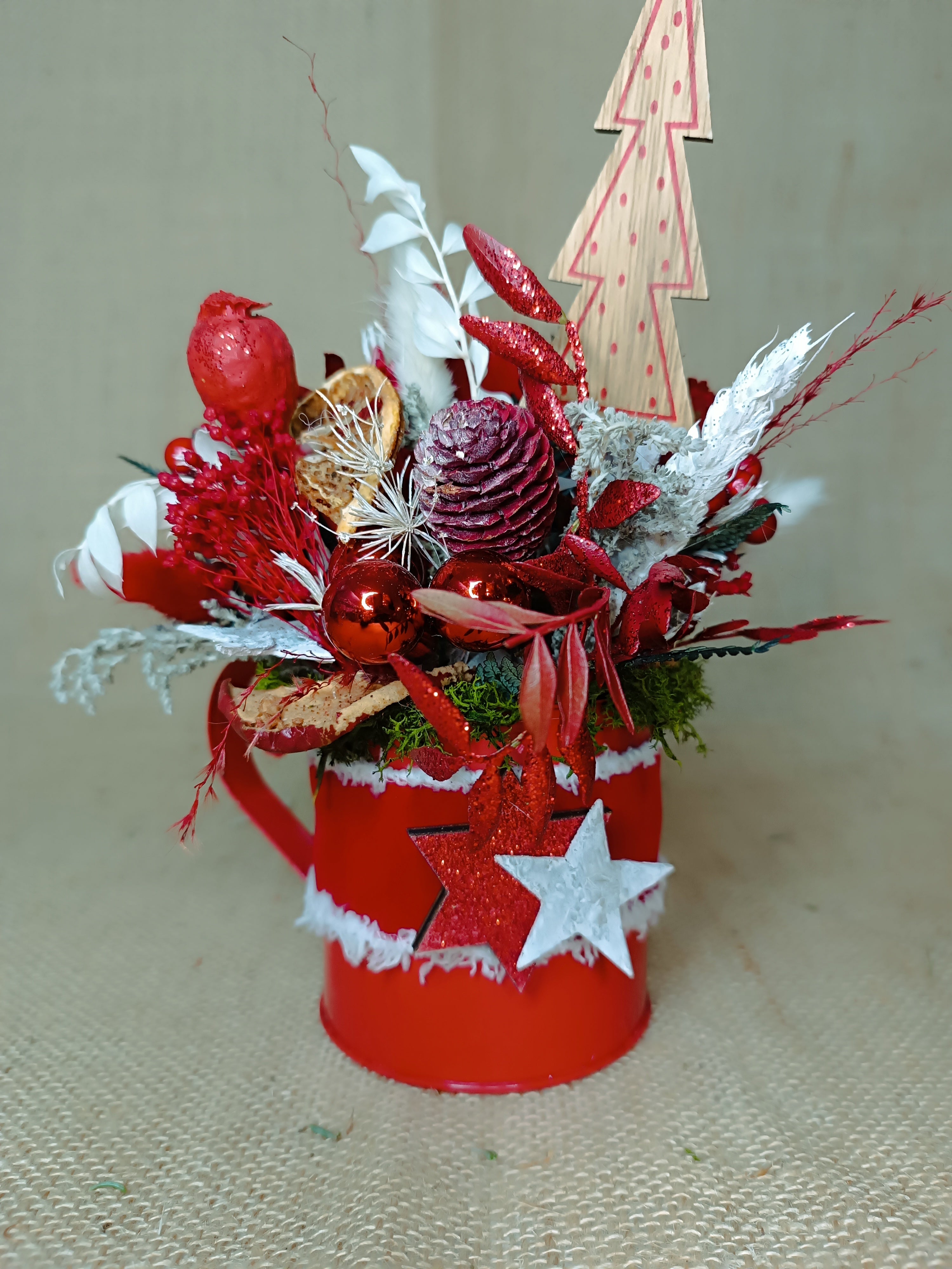 Muy "British" este arreglo en seco y preservado. Taza de zinc roja decorada con un emotivo lazo de terciopelo rojo con pelito blanco o con uno más masculino en cuadros rojos y negros Arreglo con flores con toques blancos, rojos y elementos naturales cómo canela y naranja deshidratada. El arreglo tiene una altura aproximada de 23 cm