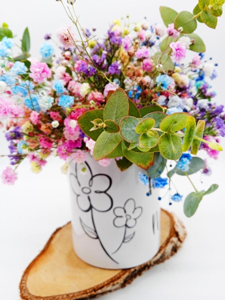 Taza floral con arreglo con paniculata de colores y con mensaje personalizable. La impresión se realiza por sublimación así que tu taza lo anguantará todo: microondas, lavavajillas...