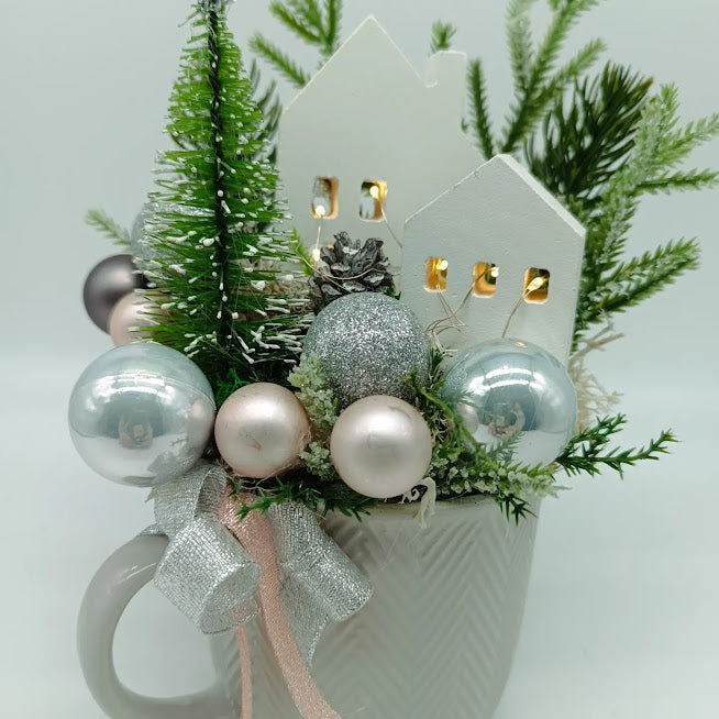 Disfruta esta taza navideña, con un arreglo decorativo navideño. Por la noche podrás disfrutar de la luz que proporciona para crear un ambiente perfecto para la Navidad. Ninguna composición es igual a otra, dependerá de nuestro momento de inspiración. Antes de proceder s su envío nos pondremos en contacto contigo para que puedas ver el trabajo y así darnos tu visto bueno. El período de elaboración es de 48/72 horas desde el momento del pedido