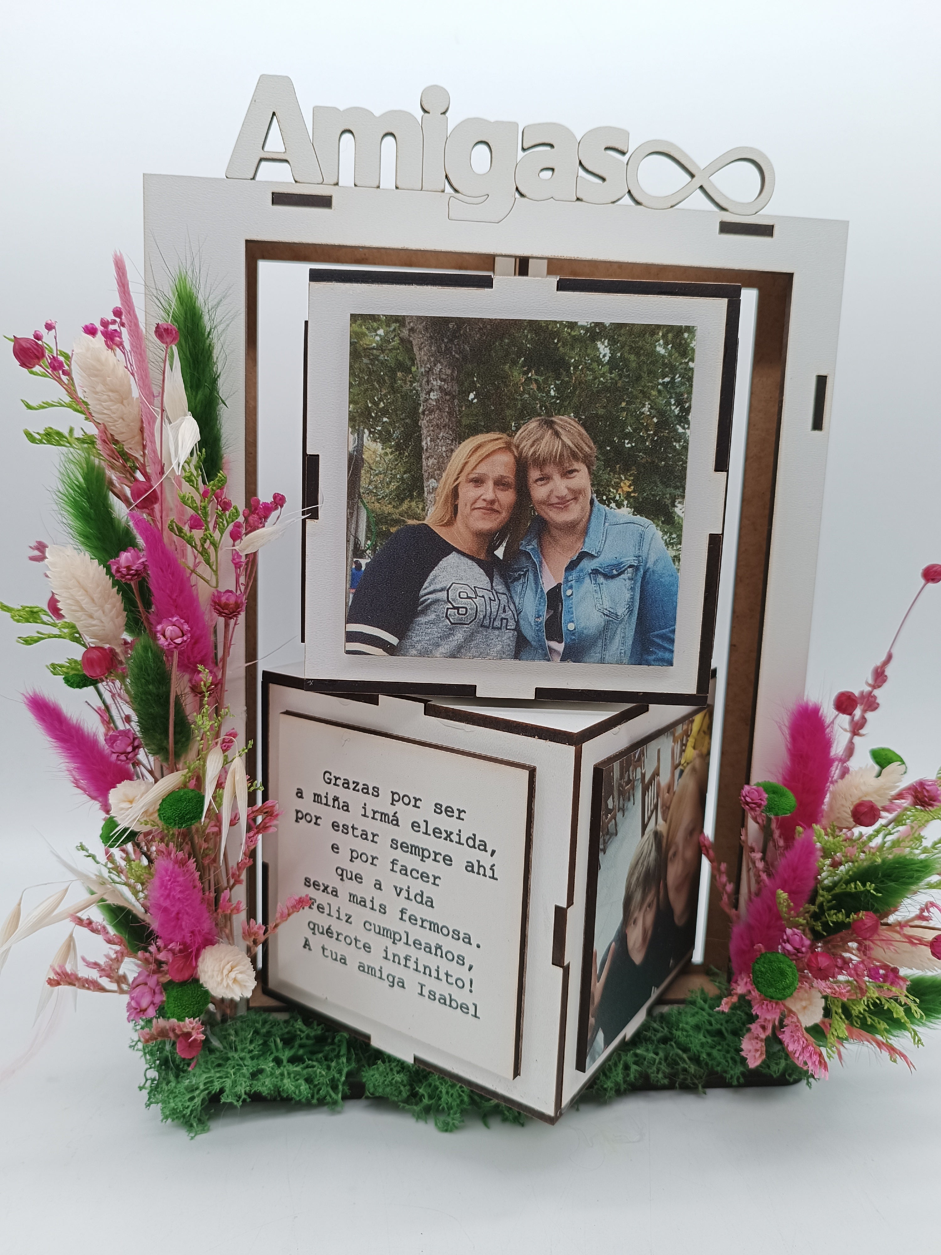 Este producto es una auténtica cucada. Se trata de una estructura de madera que contiene dos cubos en los que podrás colocar las cuatro fotos que tú prefieras en cada uno de ellos.  La torre va decorada con flores secas y preservadas. Si no te gustan los colores de la muestra nos puedes indicar tú los colores que más te gusten.  Además en la parte de arriba puedes colocar un te quiero o el nombre de la persona a la que le quieras dedicar este regalo. También puede ser el de tu mascota favorita.  El plazo de elaboración es de entre seis y siete días laborables. Haces el pedido, nos envías las fotos a nuestra dirección de correo electrónico ( xardinalia @xardinalia.es) y en el apartado de observaciones que aparece al finalizar el proceso de compra nos puedes indicar los colores que quieres que utilicemos para la decoración floral y la palabra a incluir en la parte superior de la estructura. También puede sustituir alguna de las fotos por un mensaje especial que nosotros grabaremos en la madera.  Para cualquier duda vuestro producto no dudes en ponerte en contacto con nosotros a través del chat de la tienda online, por...